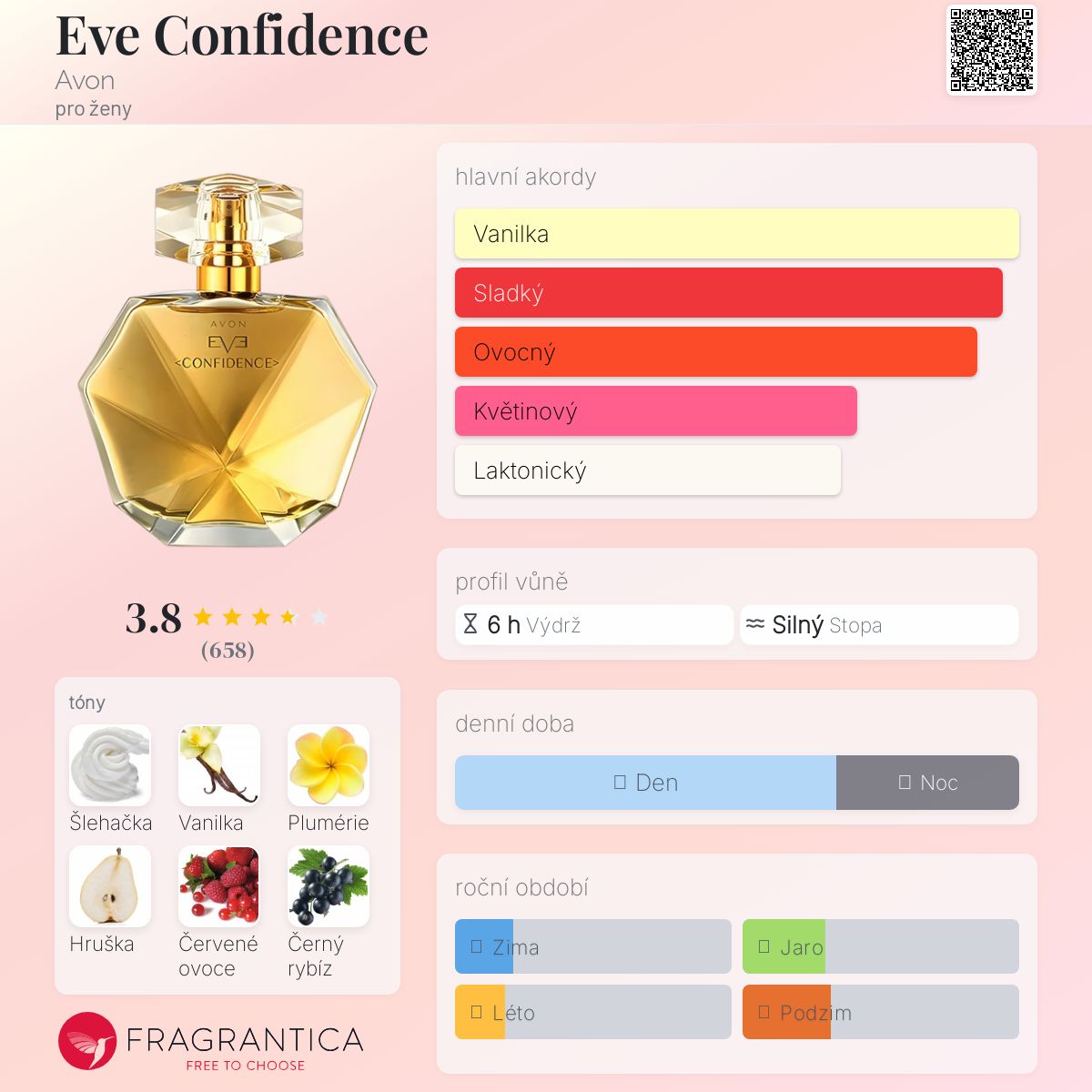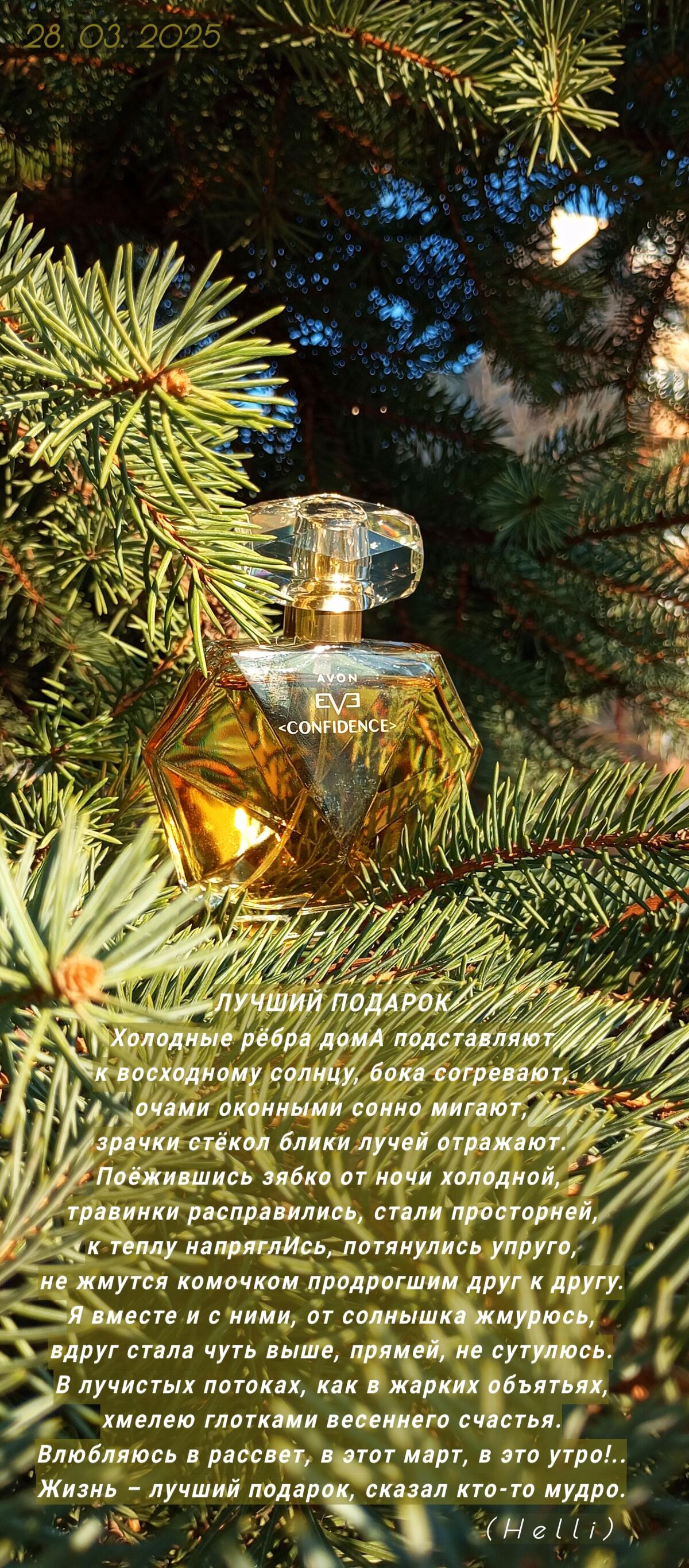 Eve Confidence podle Avon je Orientální Floral vůně pro ženy. Eve Confidence byl/a uveden/a v roce 2018. "Nosem" za touto vůní je Honorine Blanc. Vrchní tóny jsou Šlehačka, Hruška a Černý rybíz; střední tóny jsouPlumérie, Červené ovoce a Jasmín ; základní tóny jsou Vanilka, Pižmo a Dub.