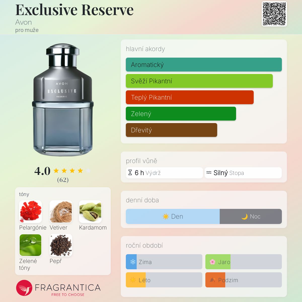 Exclusive Reserve podle Avon je Woody Aromatic vůně pro muže. Exclusive Reserve byl/a uveden/a v roce 2019. "Nosem" za touto vůní je Carmita Magalhaes. Vrchní tóny jsou Kardamom a Pepř; střední tóny jsouPelargónie a Zelené listí ; základní tón je Haitský vetiver.