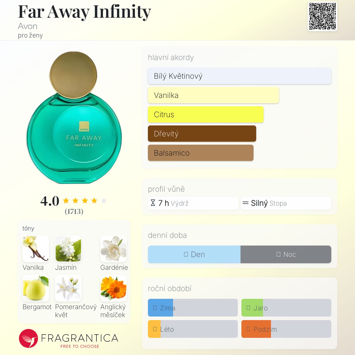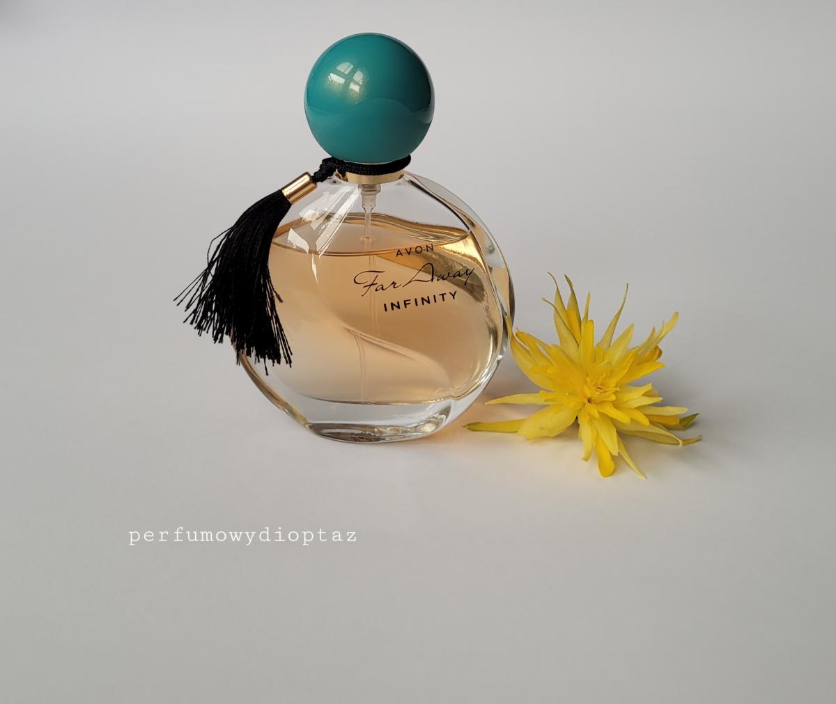 Far Away Infinity podle Avon je Floral Fruity vůně pro ženy. Far Away Infinity byl/a uveden/a v roce 2016. "Nosem" za touto vůní je Honorine Blanc. Vrchní tóny jsou Gardénie, Bergamot a Měsíček; střední tóny jsouJasmín, Jasmín Sambac a Pomerančový květ ; základní tóny jsou Vanilka, Santalové dřevo a Pačuli.
