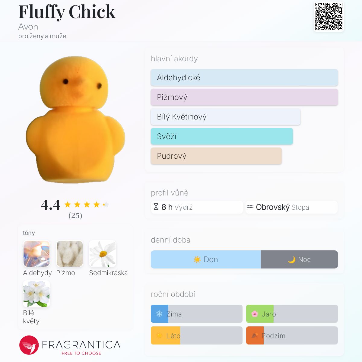 Fluffy Chick podle Avon je Floral vůně pro ženy a muže. Fluffy Chick byl/a uveden/a v roce 1970. Vrchní tóny jsou Aldehydy a Sedmikráska; střední tóny jsouSedmikráska a Bílé květy ; základní tón je Pižmo.