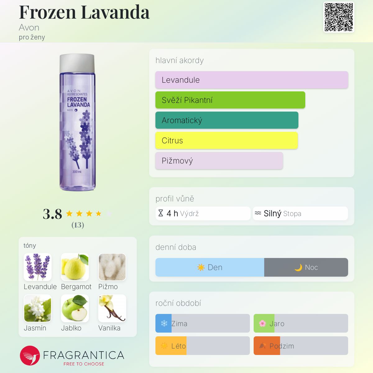 Frozen Lavanda podle Avon je Floral Fruity vůně pro ženy. Frozen Lavanda byl/a uveden/a v roce 2017. Vrchní tóny jsou Levandule, Bergamot a Jablko; střední tón jeJasmín ; základní tóny jsou Pižmo, Vanilka a Jantar (ambra).