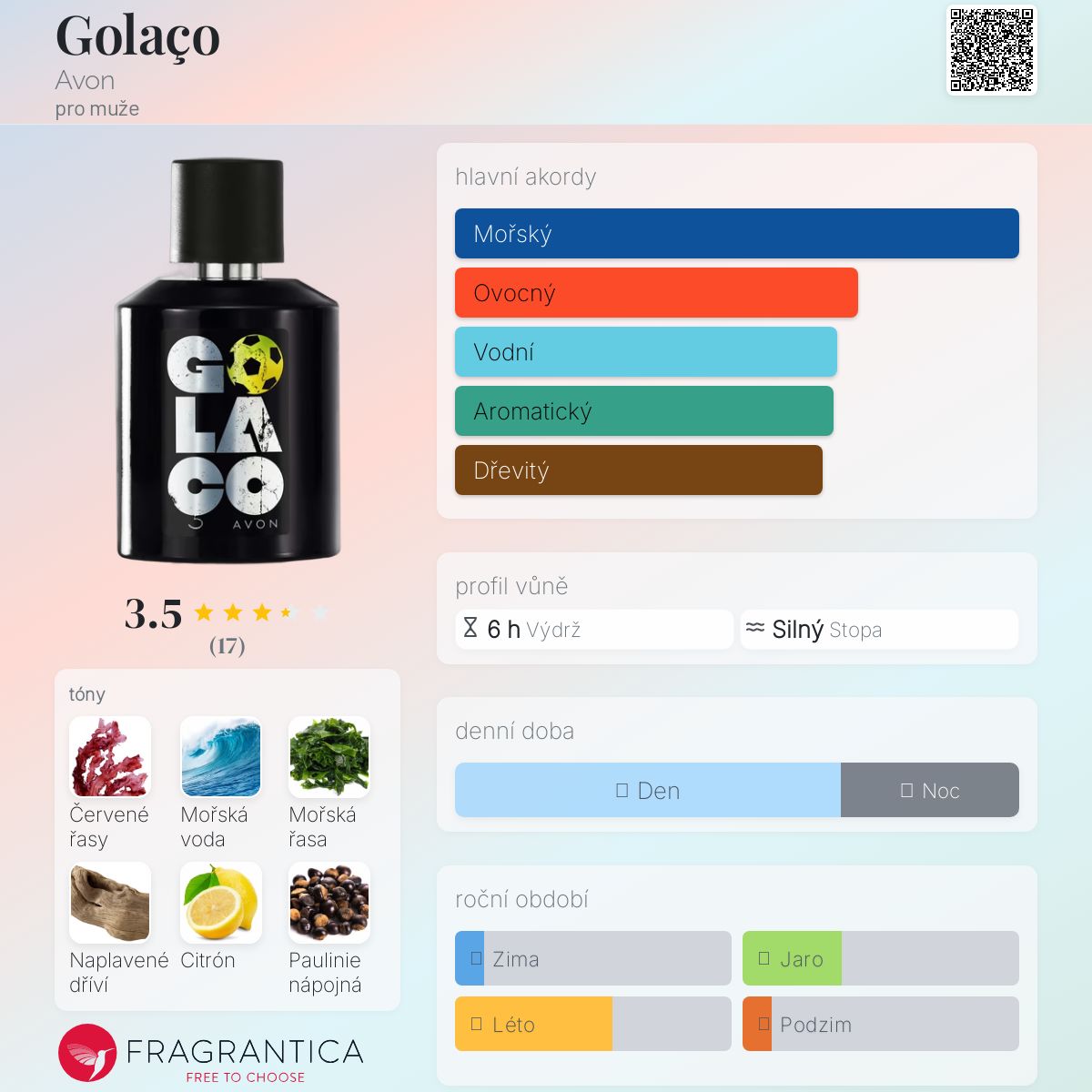 Golaço podle Avon je Woody Aromatic vůně pro muže. Golaço byl/a uveden/a v roce 2014. "Nosem" za touto vůní je Carmita Magalhães. Vrchní tóny jsou Červené řasy, Mořská voda, Mořská řasa, Sicilský citron, Masticha a Růžový pepř; střední tóny jsouPaulinie nápojná, Meloun, Červené jablko a Granny Smith jablko ; základní tóny jsou Naplavené dříví, Přírodní pižmo, Jantar (ambra) a Dřevité tóny.