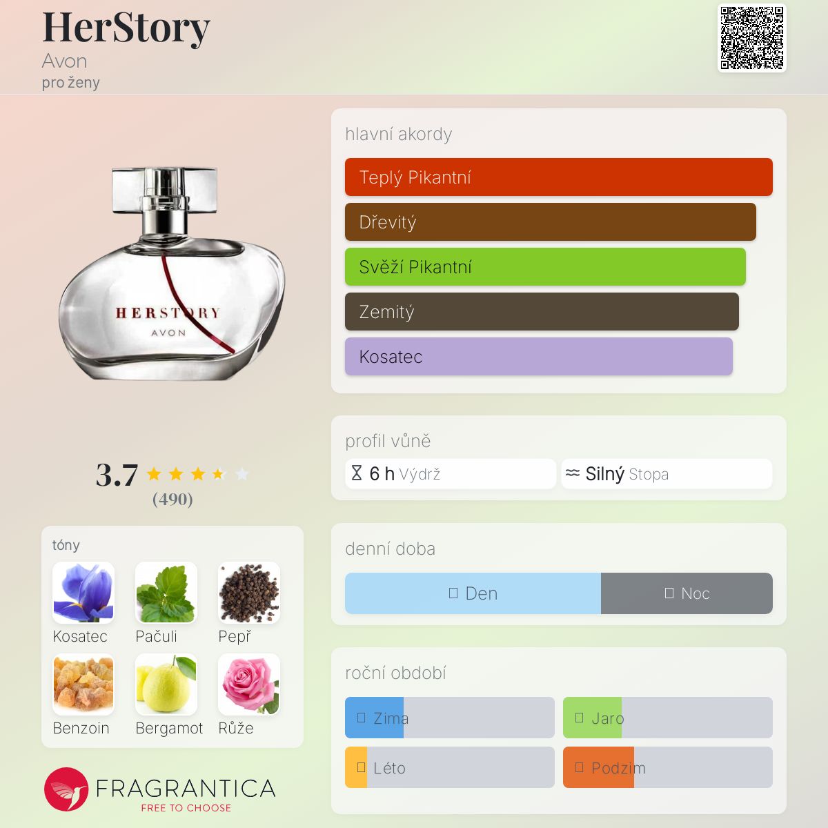 HerStory podle Avon je Orientální Floral vůně pro ženy. HerStory byl/a uveden/a v roce 2020. HerStory byl/a vytvořen/a Honorine Blanc a Adilson Rato. Vrchní tóny jsou Bourbonský pepř, Bergamot a Broskvový květ; střední tóny jsouKosatec, Růže a Slaměnka ; základní tóny jsou Pačuli, Benzoin a Vetiver.