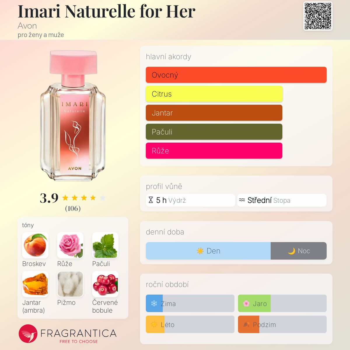 Imari Naturelle for Her podle Avon je Floral Fruity vůně pro ženy a muže. Toto je nová vůně. Imari Naturelle for Her byl/a uveden/a v roce 2024. Vrchní tóny jsou Květná růže, Červené bobule a Bergamot; střední tóny jsouBroskev, Magnólie a Jasmín ; základní tóny jsou Pačuli, Jantar (ambra) a Pižmo.