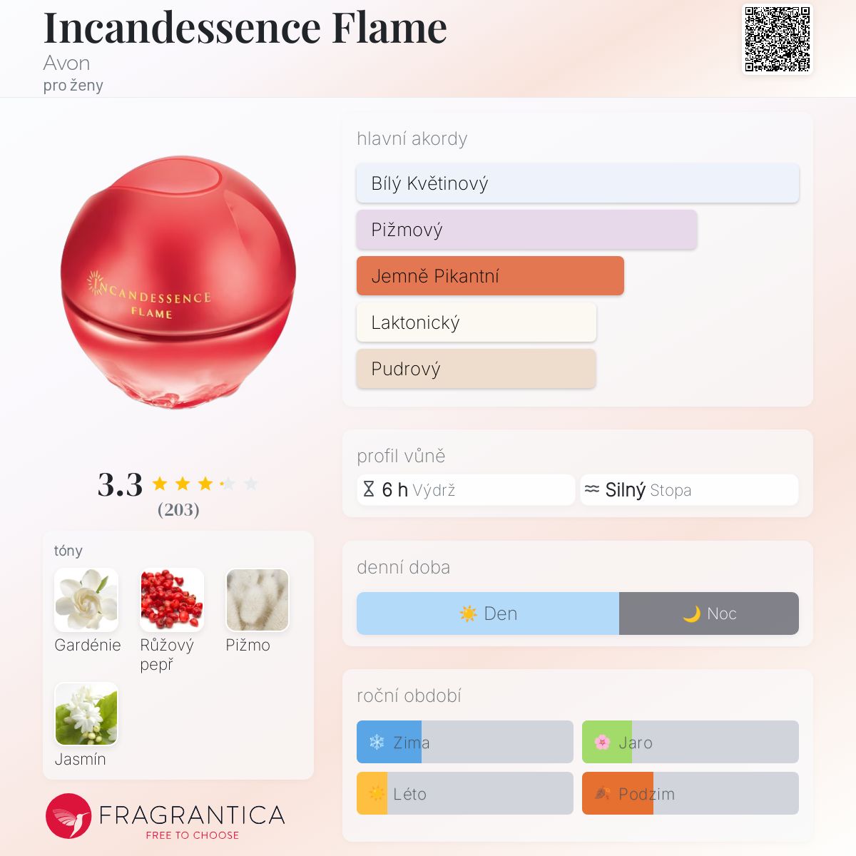 Incandessence Flame podle Avon je Floral Woody Musk vůně pro ženy. Incandessence Flame byl/a uveden/a v roce 2014. Vrchní tón je Růžový pepř ; střední tóny jsouGardénie a Jasmín ; základní tón je Pižmo.