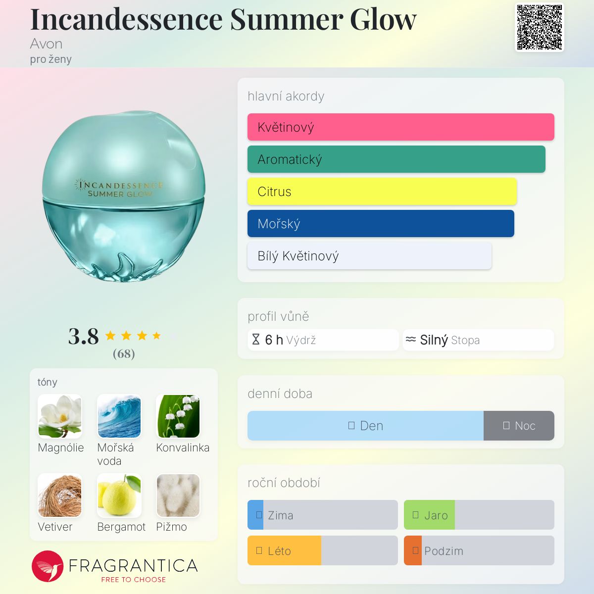 Incandessence Summer Glow podle Avon je Floral vůně pro ženy. Toto je nová vůně. Incandessence Summer Glow byl/a uveden/a v roce 2024. Vrchní tóny jsou Bergamot, Zelené jablko a Bílá růže; střední tóny jsouMagnólie, Konvalinka a Vodní tóny ; základní tóny jsou Haitský vetiver, Pižmo a Jantar (ambra).
