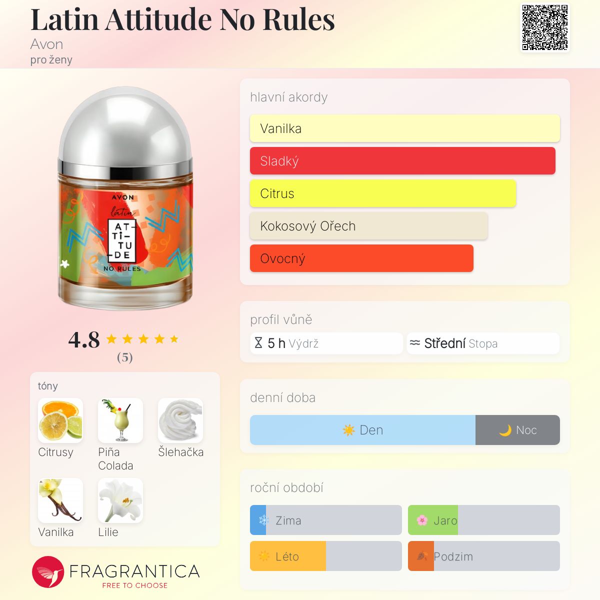 Latin Attitude No Rules podle Avon je Floral Fruity vůně pro ženy. Latin Attitude No Rules byl/a uveden/a v roce 2021. Vrchní tón je Citrusy ; střední tóny jsouPiña Colada a Lilie ; základní tóny jsou Šlehačka a Vanilka.