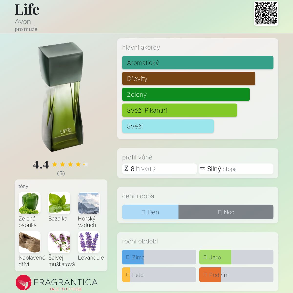 Life podle Avon je Aromatic Fougere vůně pro muže. Life byl/a uveden/a v roce 2007. "Nosem" za touto vůní je Ilias Ermenidis. Vrchní tóny jsou Bazalka, Horský vzduch, Šalvěj muškátová a Yuzu; střední tóny jsouZelená paprika, Naplavené dříví, Levandulový extrakt a Kardamom ; základní tóny jsou Pižmo, Jantarové dřevo, Cedr, Kašmírové dřevo a Pačuli.