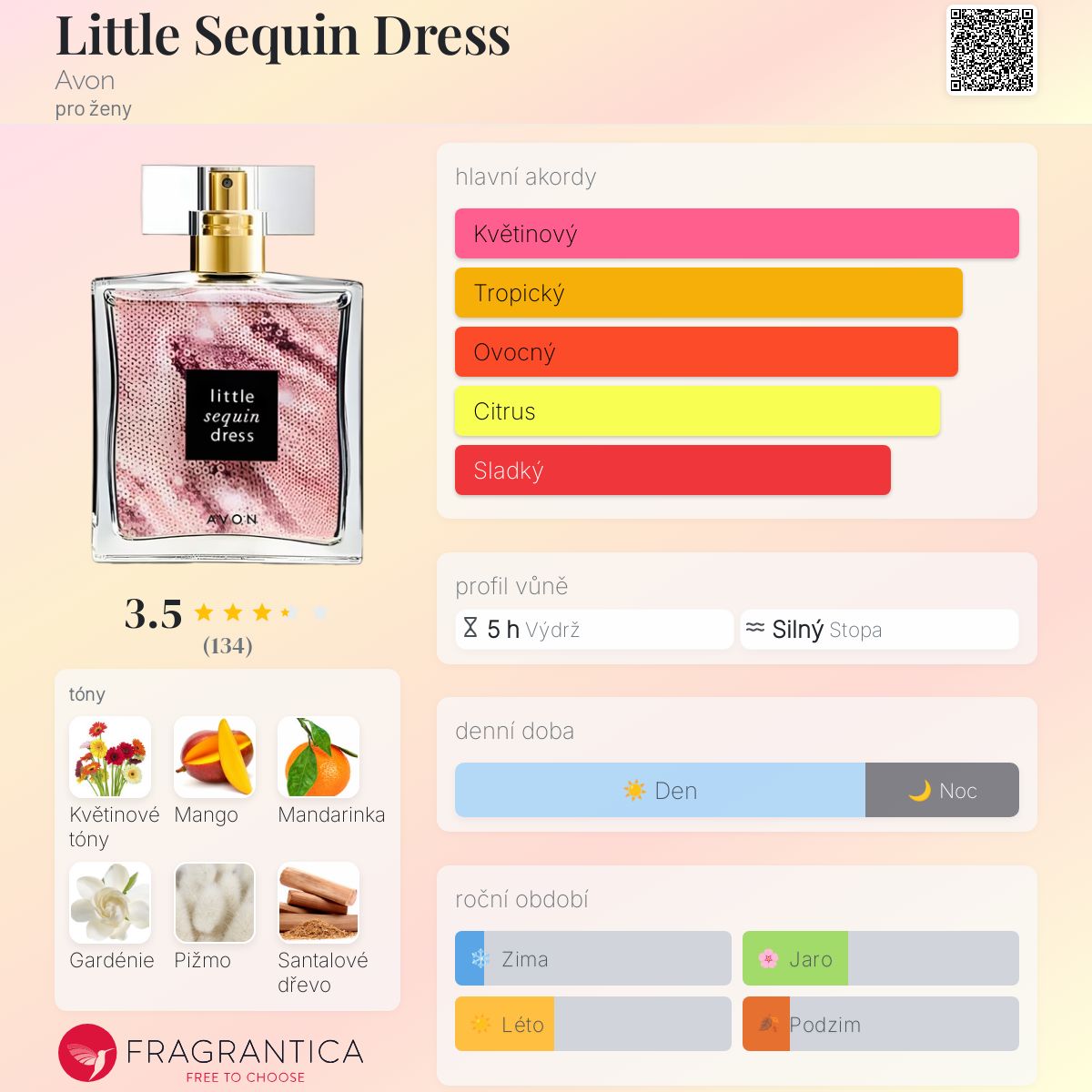 Little Sequin Dress podle Avon je Orientální Floral vůně pro ženy. Little Sequin Dress byl/a uveden/a v roce 2017. "Nosem" za touto vůní je Caroline Sabas. Vrchní tóny jsou Mango a Mandarinka; střední tóny jsouExotické květinové tóny a Gardénie ; základní tóny jsou Pižmo, Santalové dřevo a Jantar (ambra).