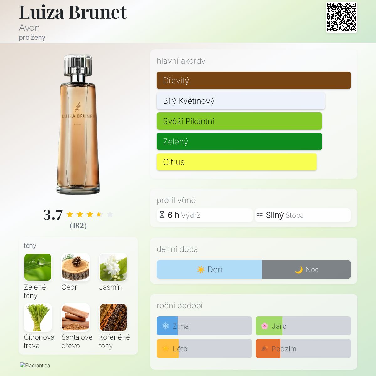 Luiza Brunet podle Avon je Orientální Vanilla vůně pro ženy. Luiza Brunet byl/a uveden/a v roce 1996. "Nosem" za touto vůní je Joachim Correl. Vrchní tóny jsou Zelené tóny, Citronová tráva, Levandule a Pomeranč; střední tóny jsouJasmín, Kořeněné tóny, Konvalinka a Pelargónie ; základní tóny jsou Cedr, Santalové dřevo, Mech, Jantar (ambra) a Pižmo.