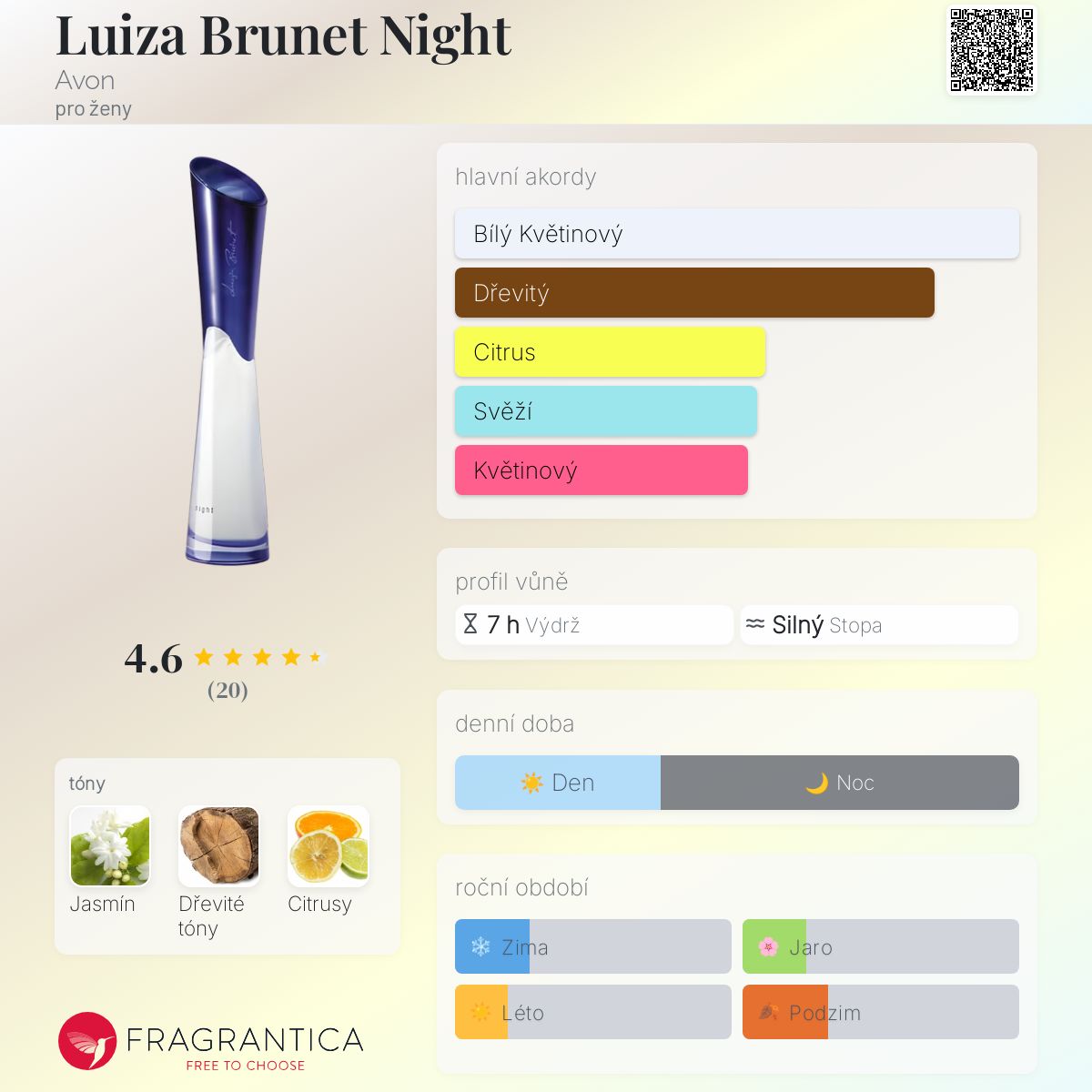 Luiza Brunet Night podle Avon je Orientální vůně pro ženy. Luiza Brunet Night byl/a uveden/a v roce 2003. Vrchní tón je Citrusy ; střední tón jeJasmín ; základní tón je Dřevité tóny.