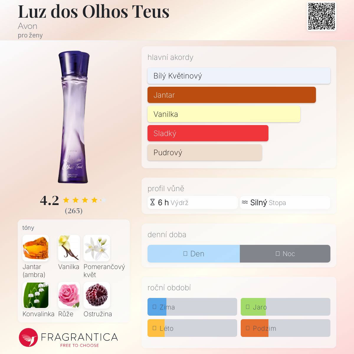 Luz dos Olhos Teus podle Avon je Orientální vůně pro ženy. Luz dos Olhos Teus byl/a uveden/a v roce 2001. "Nosem" za touto vůní je Honorine Blanc. Vrchní tóny jsou Ostružina, Bílá broskev, Muškátový oříšek a Růžový pepř; střední tóny jsouPomerančový květ, Konvalinka a Damašská růže ; základní tóny jsou Jantar (ambra), Bourbonská vanilka a Španělské labdanum.