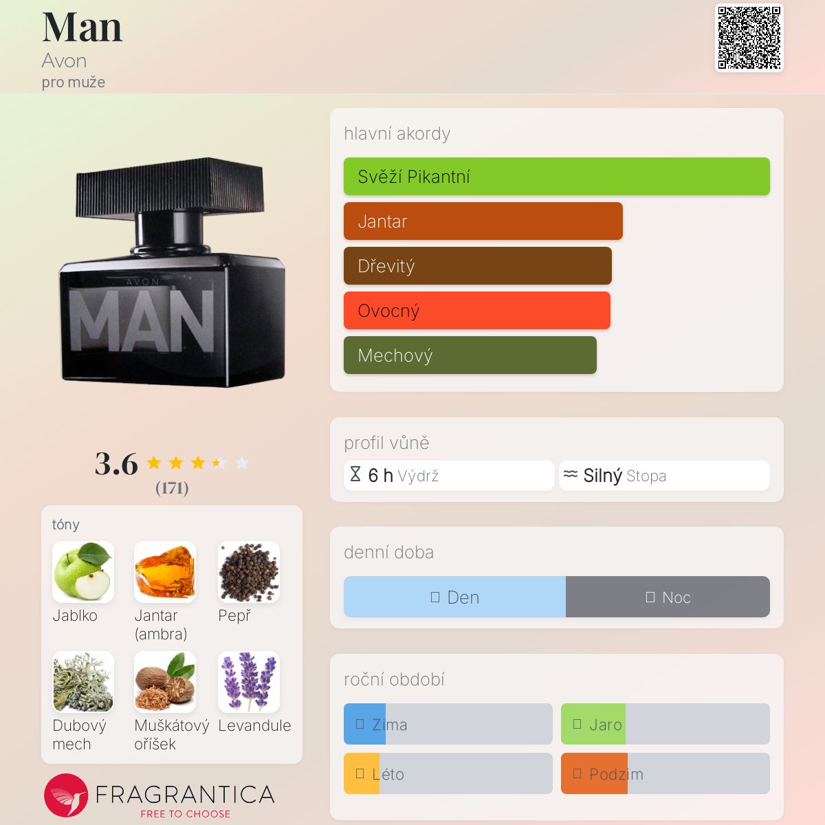 Man podle Avon je Aromatic vůně pro muže. Man byl/a uveden/a v roce 2017. Vrchní tóny jsou Černý pepř, Bergamot a List bergamotu; střední tóny jsouJablko, Muškátový oříšek a Levandule ; základní tóny jsou Jantar (ambra), Mech a Guajakové dřevo.
