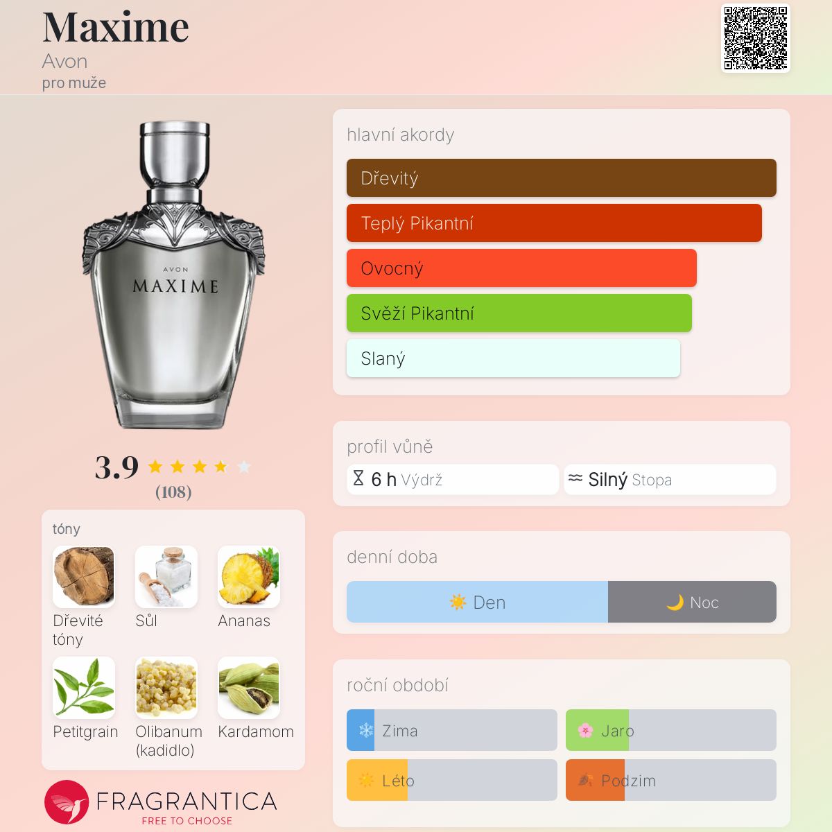 Maxime podle Avon je Orientální Woody vůně pro muže. Maxime byl/a uveden/a v roce 2019. Maxime byl/a vytvořen/a Pascal Gaurin a Clement Gavarry. Vrchní tóny jsou Ananas, Mandarinkový list a Muškátový oříšek; střední tóny jsouVzácné dřevo, Mořská sůl a Kardamom ; základní tóny jsou Olibanum, Skořice a Kůže.