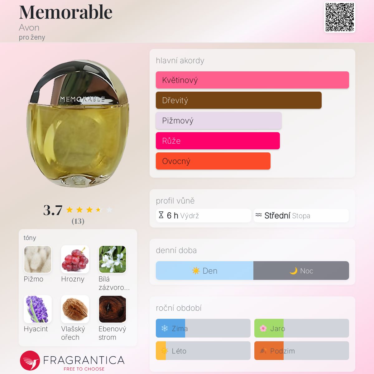 Memorable podle Avon je Floral Fruity vůně pro ženy. Memorable byl/a uveden/a v roce 2003. Vrchní tóny jsou Hrozny, Bílá zázvorová lilie, Hyacint, Zelená mandarinka a Frézie; střední tóny jsouLilie, Růže a Růžová pivoňka ; základní tóny jsou Pižmo, Vlašský ořech, Eben a Santalové dřevo.