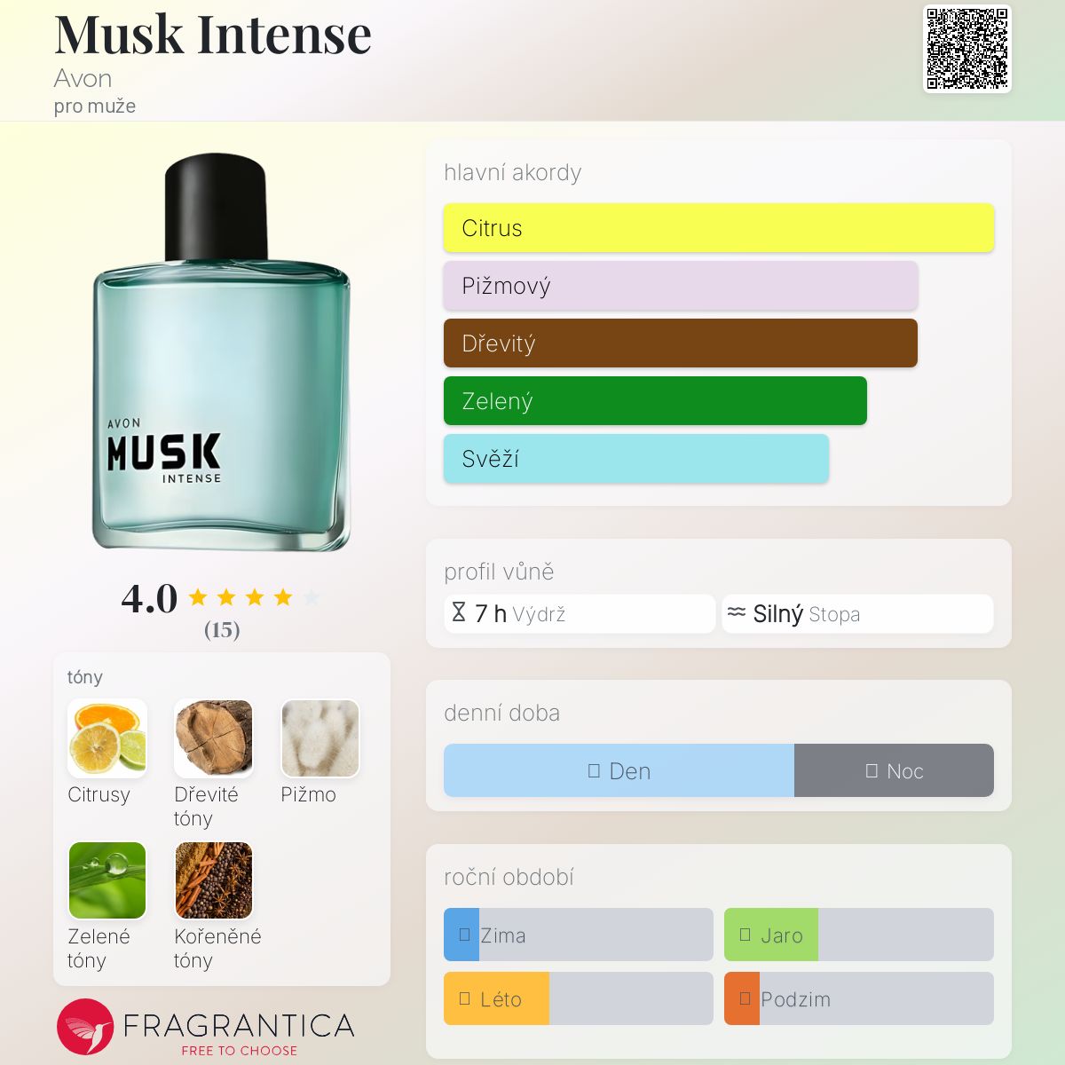 Musk Intense podle Avon je Woody Spicy vůně pro muže. Musk Intense byl/a uveden/a v roce 2010. Vrchní tóny jsou Citrusy a Zelené tóny; střední tóny jsouDřevité tóny a Koření ; základní tón je Pižmo.