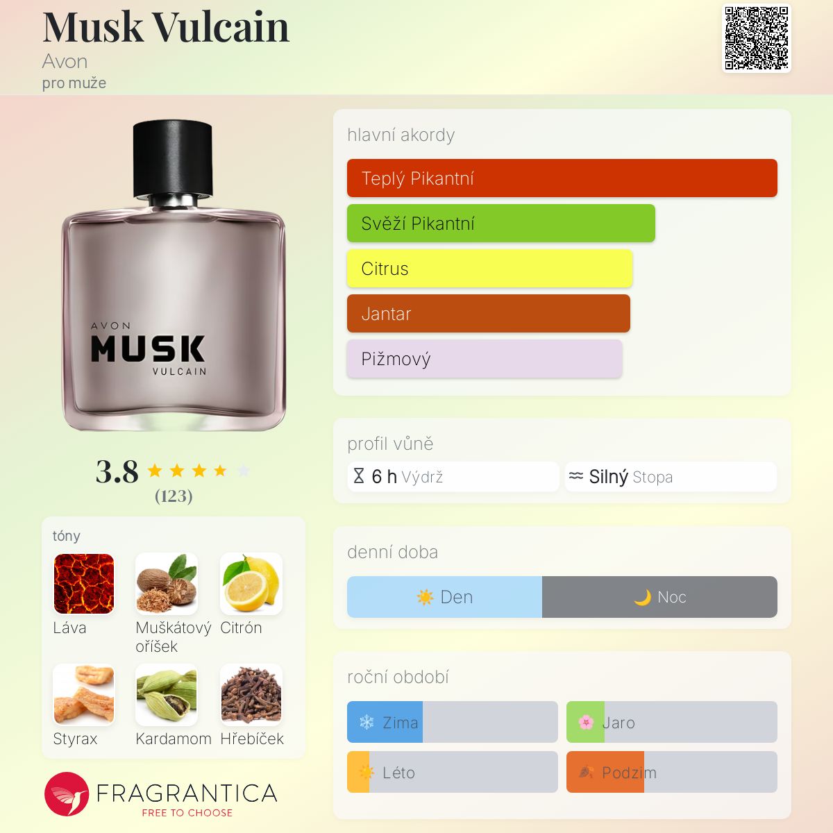 Musk Vulcain podle Avon je Woody Aromatic vůně pro muže. Musk Vulcain byl/a uveden/a v roce 2017. Vrchní tóny jsou Italský citrón, Guatemalský kardamom a Jablko; střední tóny jsouMuškátový oříšek, Madagaskarský hřebíček a List indonéského pačuli ; základní tóny jsou Láva, Styrax a Pižmo.