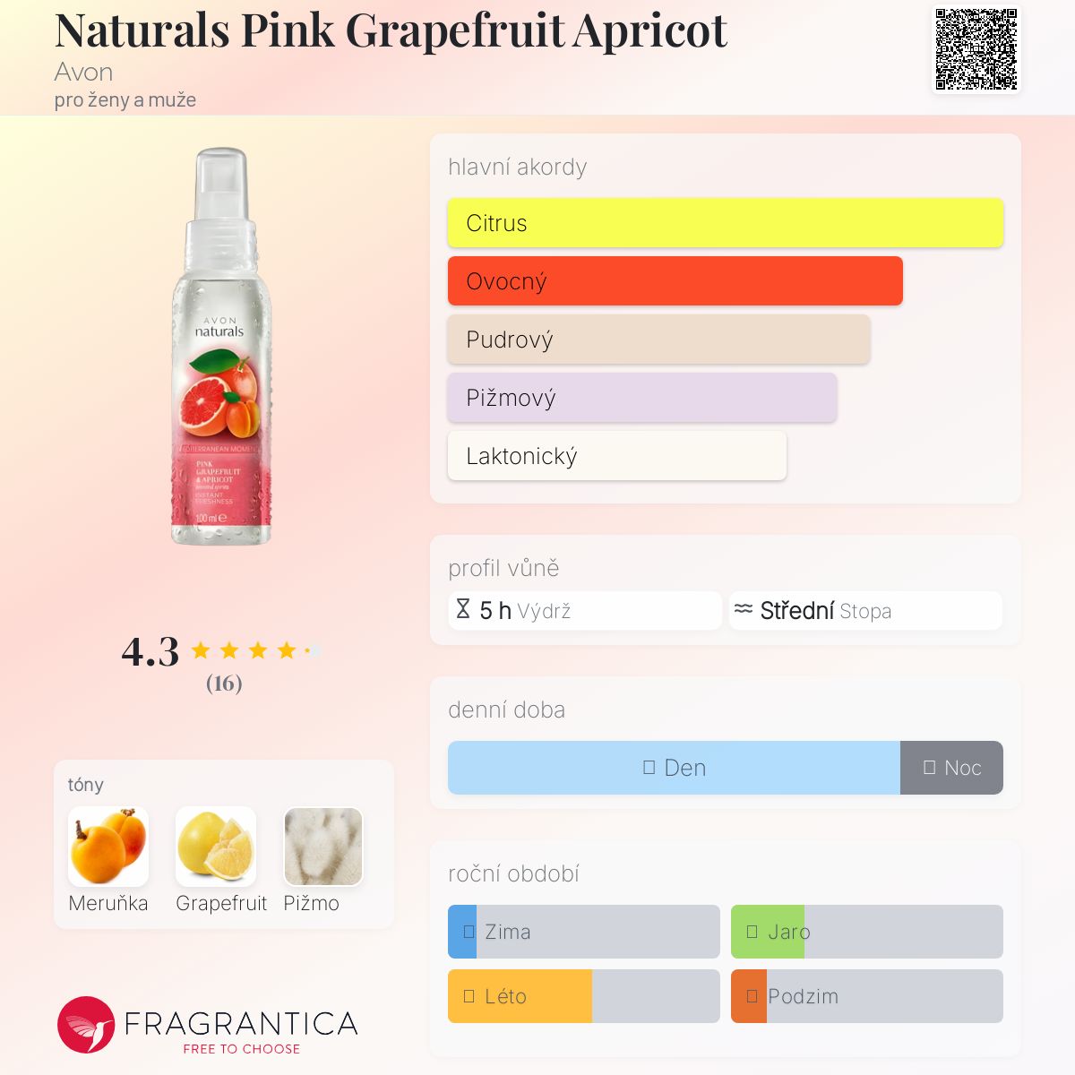 Naturals Pink Grapefruit Apricot podle Avon je Aromatic Fruity vůně pro ženy a muže. Naturals Pink Grapefruit Apricot byl/a uveden/a v roce 2019. Vrchní tón je Růžový grapefruit ; střední tón jeMeruňka ; základní tón je Pižmo.