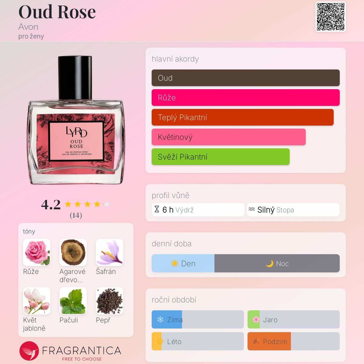 Oud Rose podle Avon je Floral vůně pro ženy. Oud Rose byl/a uveden/a v roce 2022. Vrchní tóny jsou Šafrán, Černý pepř a Mučenka; střední tóny jsouRůže de Mai, Květ jabloně a Káva ; základní tóny jsou Agarové dřevo (oud), Pačuli a Jantar (ambra).