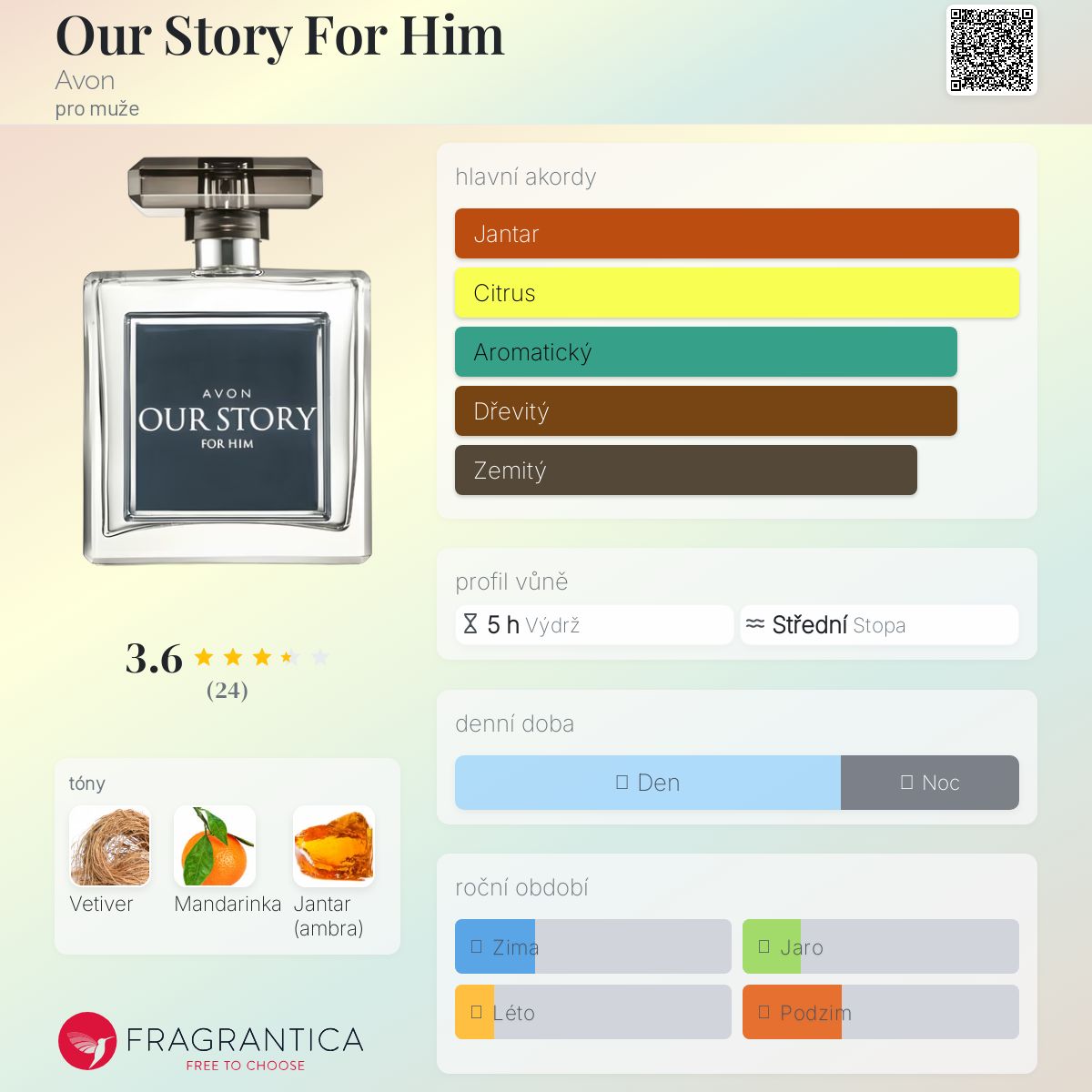Our Story For Him podle Avon je Woody Aromatic vůně pro muže. Our Story For Him byl/a uveden/a v roce 2014. "Nosem" za touto vůní je Olivier Cresp.