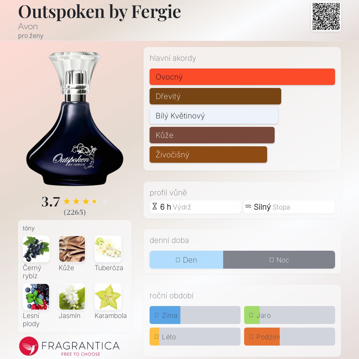 Outspoken by Fergie podle Avon je Orientální Woody vůně pro ženy. Outspoken by Fergie byl/a uveden/a v roce 2010. Vrchní tóny jsou Černý rybíz, Lesní plody, Karambola a Šafrán; střední tóny jsouTuberóza, Jasmín a Mučenka ; základní tóny jsou Kůže, Ebenové dřevo a Vetiver.