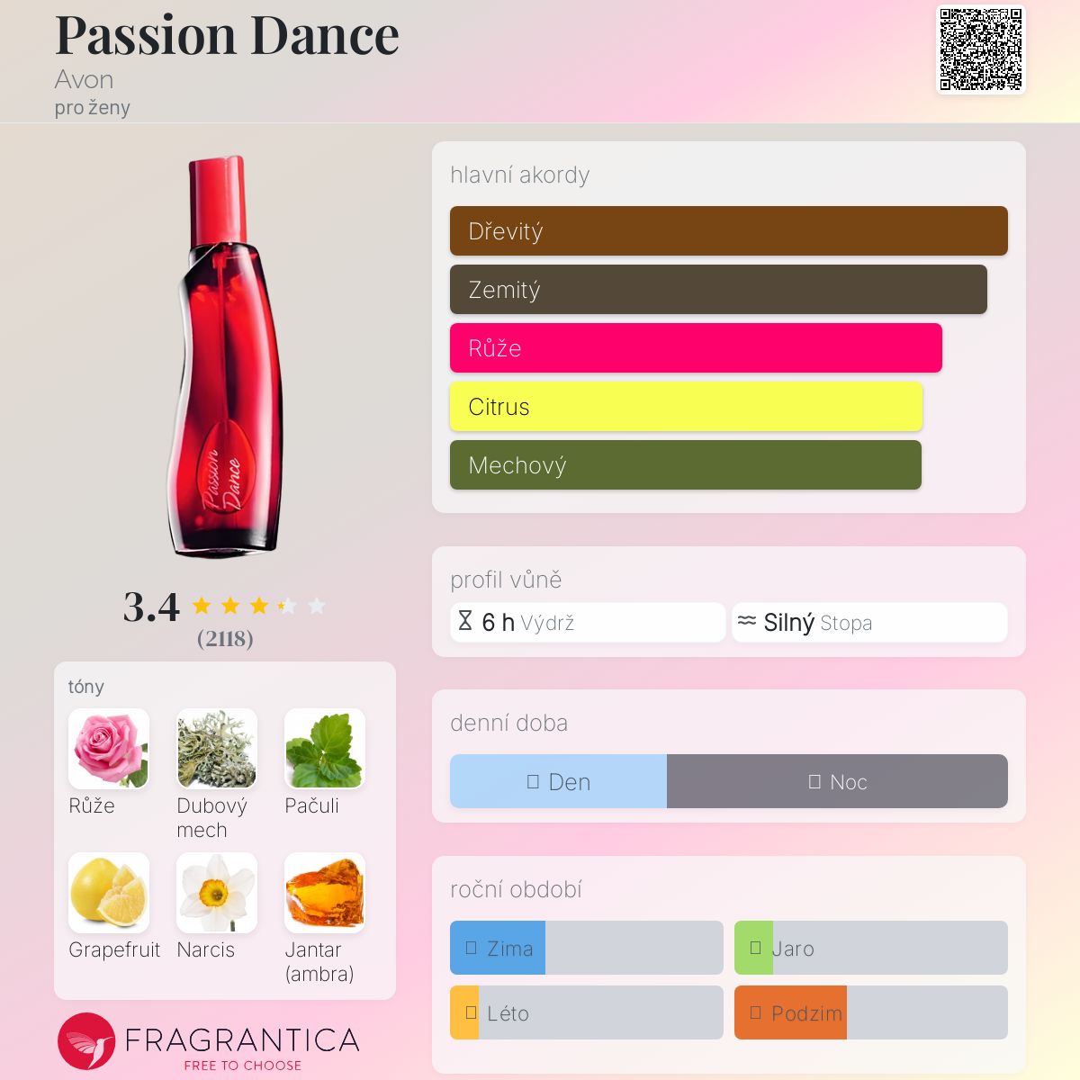 Passion Dance podle Avon je Orientální Floral vůně pro ženy. Passion Dance byl/a uveden/a v roce 2003. Vrchní tóny jsou Grapefruit, Citrón a Květ papáji; střední tóny jsouČerná růže, Narcis, Jasmín, Slaměnka a Leknín ; základní tóny jsou Dubový mech, Pačuli, Jantar (ambra), Vetiver, Santalové dřevo a Pižmo.