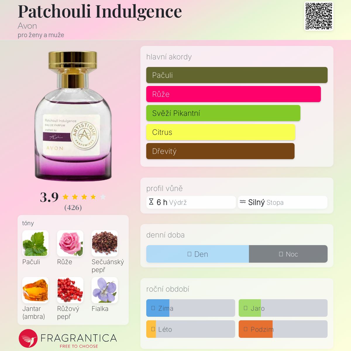 Patchouli Indulgence podle Avon je Orientální Woody vůně pro ženy a muže. Patchouli Indulgence byl/a uveden/a v roce 2020. "Nosem" za touto vůní je Alexandra Carlin. Vrchní tóny jsou Sečuánský pepř, Růžový pepř a Bergamot; střední tóny jsouRůže, Fialka a Konvalinka ; základní tóny jsou Pačuli, Jantar (ambra) a Pižmo.