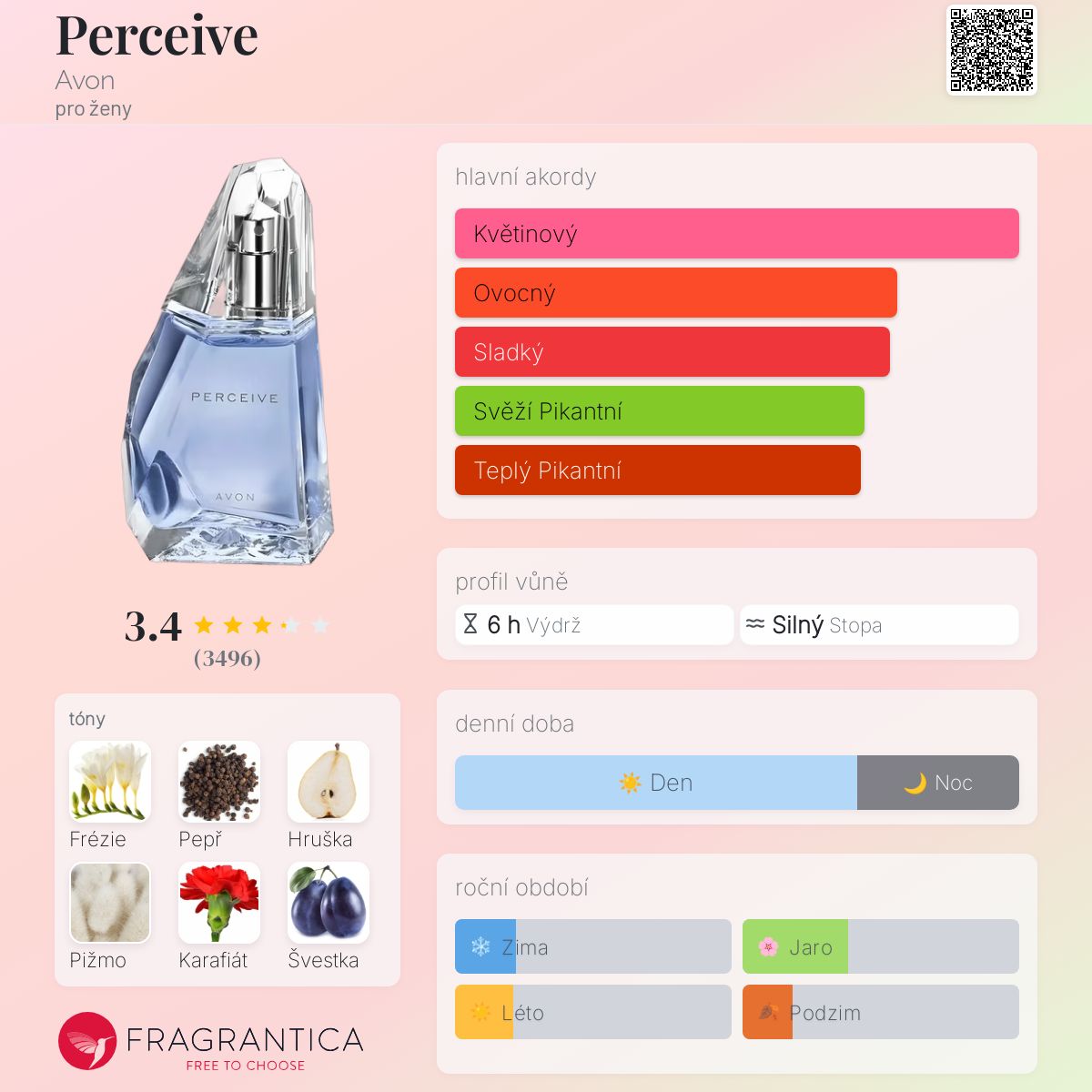 Perceive podle Avon je Orientální vůně pro ženy. Perceive byl/a uveden/a v roce 2000. "Nosem" za touto vůní je Christopher Sheldrake. Vrchní tóny jsou Žlutá frézie a Bílý pepř; střední tóny jsouHruška, Karafiát, Damašská švestka a Ylang-Ylang ; základní tóny jsou Pižmo, Santalové dřevo, Vanilková orchidej a Cedr.