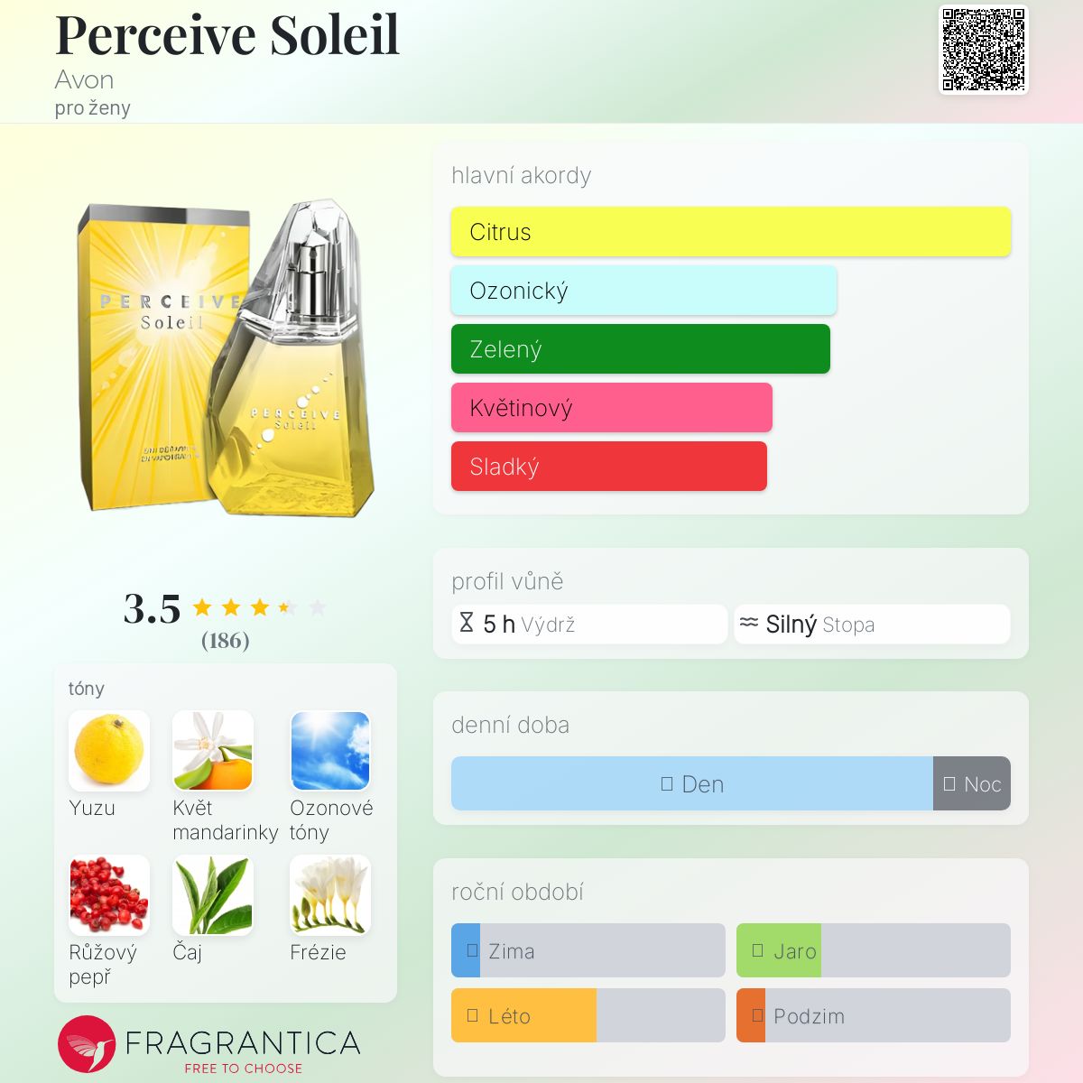 Perceive Soleil podle Avon je Citrus vůně pro ženy. Perceive Soleil byl/a uveden/a v roce 2014. Vrchní tóny jsou Yuzu, Ozonové tóny a Mandarinka; střední tóny jsouMandarinkový květ, Růžový pepř, Frézie a Fialkové listy ; základní tóny jsou Bílý čaj, Dřevité tóny a Pižmo.