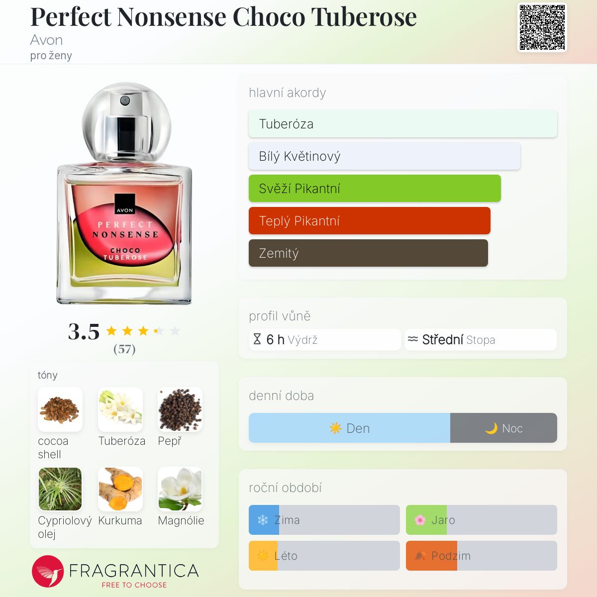 Perfect Nonsense Choco Tuberose podle Avon je Floral vůně pro ženy. Toto je nová vůně. Perfect Nonsense Choco Tuberose byl/a uveden/a v roce 2025. Vrchní tóny jsou Pepř, Cosmofruit™ (IFF) a Zázvor; střední tóny jsouIndická tuberóza, Kurkuma a Magnólie ; základní tóny jsou Kakaová slupka, Cypriolový olej a Vetiver.