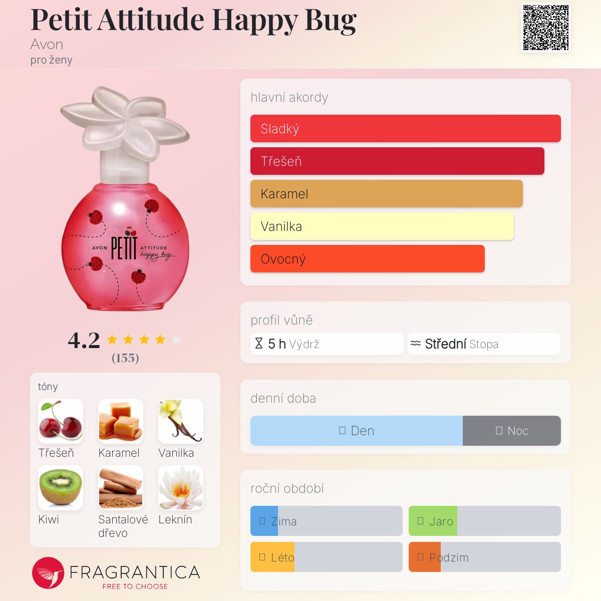 Petit Attitude Happy Bug podle Avon je Floral Fruity vůně pro ženy. Petit Attitude Happy Bug byl/a uveden/a v roce 2020. Vrchní tóny jsou Třešeň, Kiwi, Italská mandarinka a Černý rybíz; střední tóny jsouKaramel, Leknín, Damašská růže, Jasmín a Sůl ; základní tóny jsou Vanilka, Santalové dřevo a Jantar (ambra).