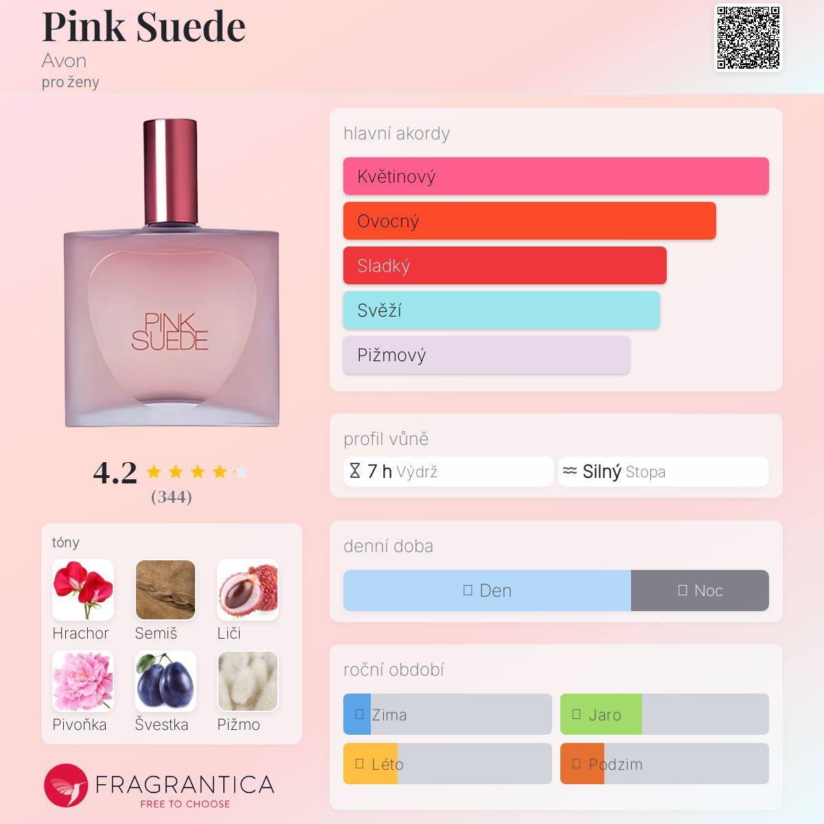 Pink Suede podle Avon je Floral Fruity vůně pro ženy. Pink Suede byl/a uveden/a v roce 2003. Vrchní tóny jsou Čínské liči, Švestka a Mandarinka; střední tóny jsouHrachor, Semiš a Růžová pivoňka ; základní tóny jsou Pižmo a Jantar (ambra).