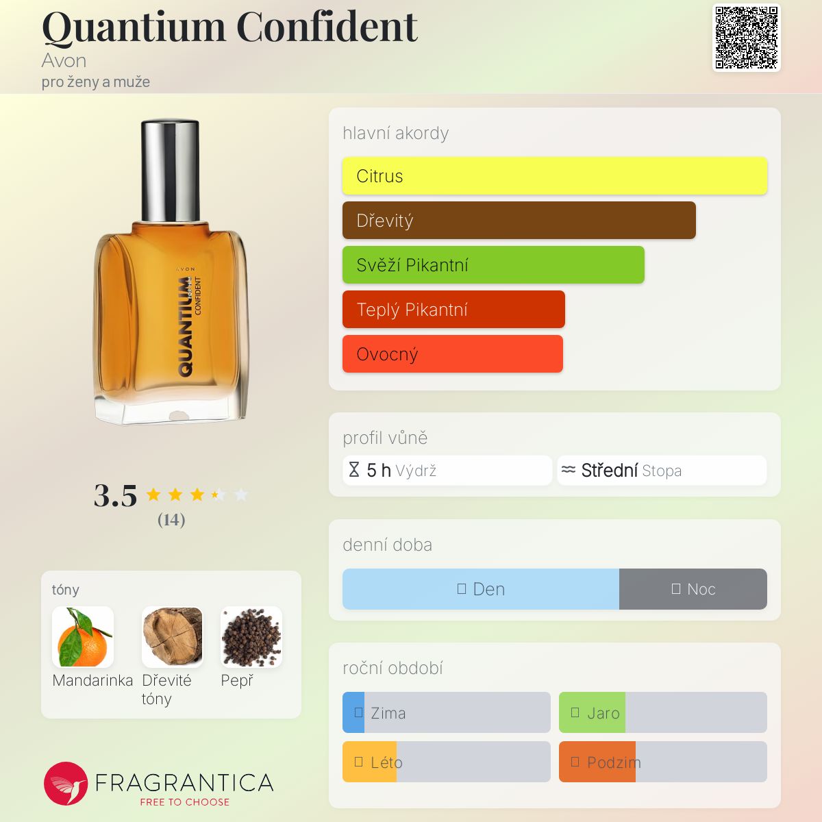 Quantium Confident podle Avon je Woody Spicy vůně pro ženy a muže. Quantium Confident byl/a uveden/a v roce 2014. Vrchní tón je Mandarinka ; střední tón jeČerný pepř ; základní tón je Dřevité tóny.