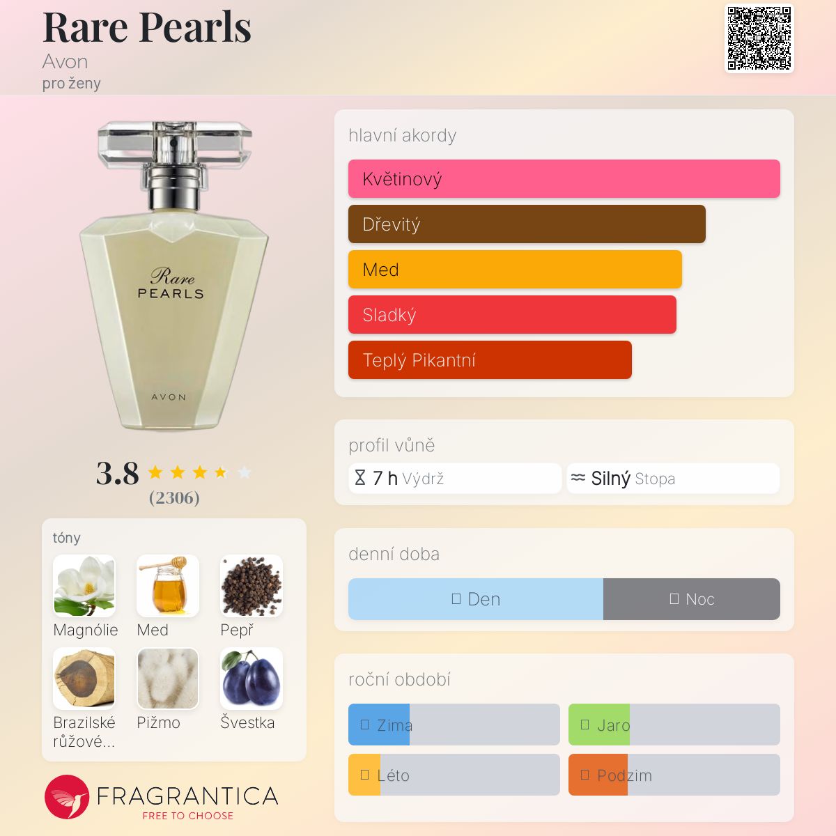 Rare Pearls podle Avon je Floral vůně pro ženy. Rare Pearls byl/a uveden/a v roce 2004. Vrchní tóny jsou Bílý med, Pepř, Brazilské růžové dřevo a Švestka; střední tón jeMagnólie ; základní tóny jsou Pižmo, Santalové dřevo a Pačuli.