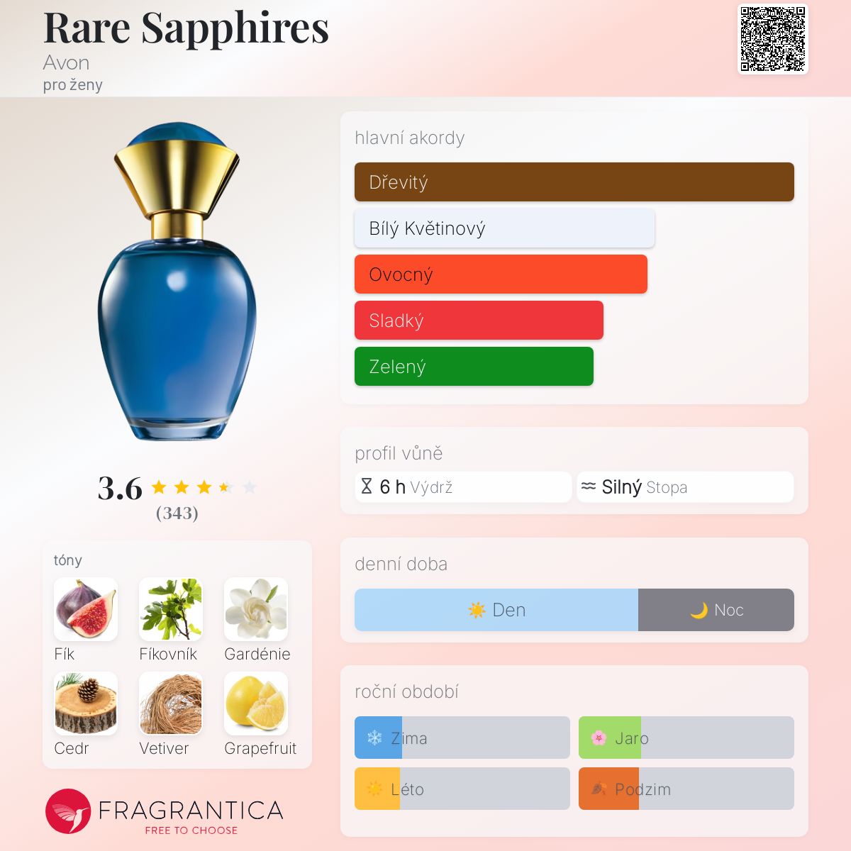 Rare Sapphires podle Avon je Floral Fruity vůně pro ženy. Vrchní tóny jsou Fík a Grapefruit; střední tóny jsouGardénie, Lilie a Sněženky ; základní tóny jsou Fíkovník, Cedr a Vetiver.