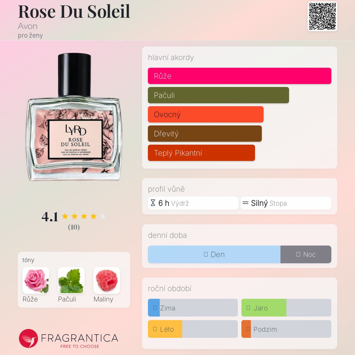 Rose Du Soleil podle Avon je vůně pro ženy. Rose Du Soleil byl/a uveden/a v roce 2021. Vrchní tón je Maliny ; střední tón jeRůže ; základní tón je Pačuli.