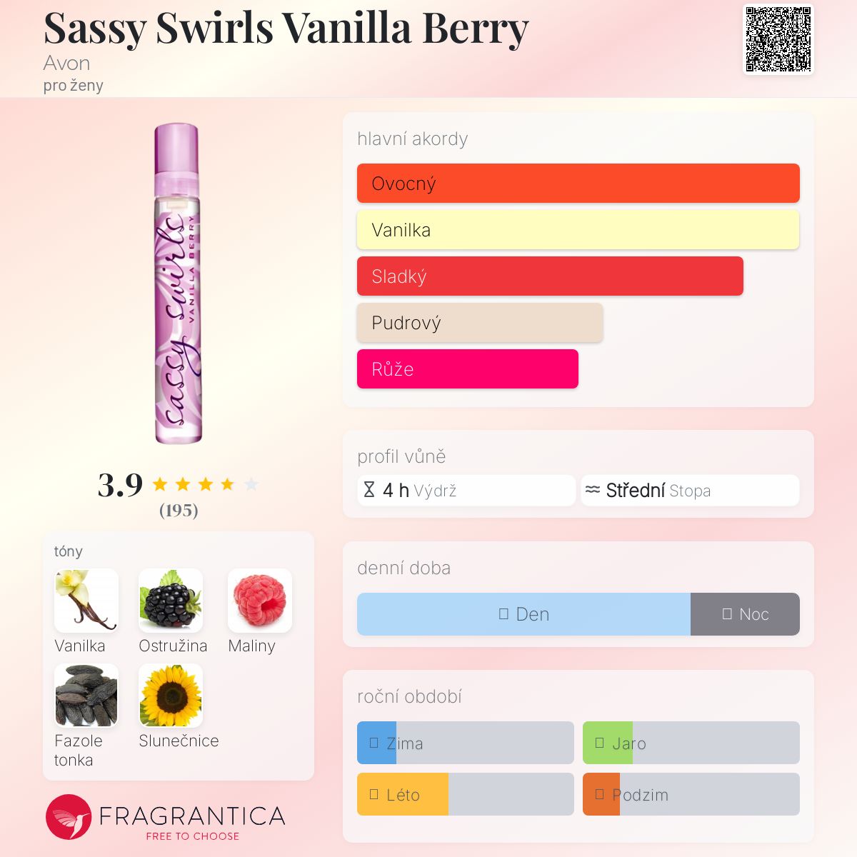 Sassy Swirls Vanilla Berry podle Avon je Floral Fruity Gourmand vůně pro ženy. Sassy Swirls Vanilla Berry byl/a uveden/a v roce 2011.