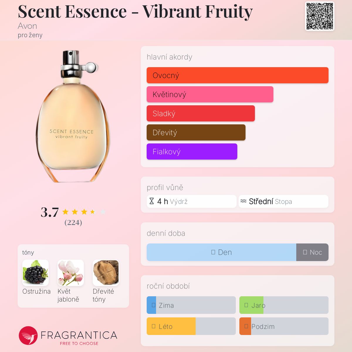 Scent Essence - Vibrant Fruity podle Avon je Floral Fruity vůně pro ženy. Scent Essence - Vibrant Fruity byl/a uveden/a v roce 2014. Vrchní tón je Ostružina ; střední tón jeKvět jabloně ; základní tón je Dřevité tóny.