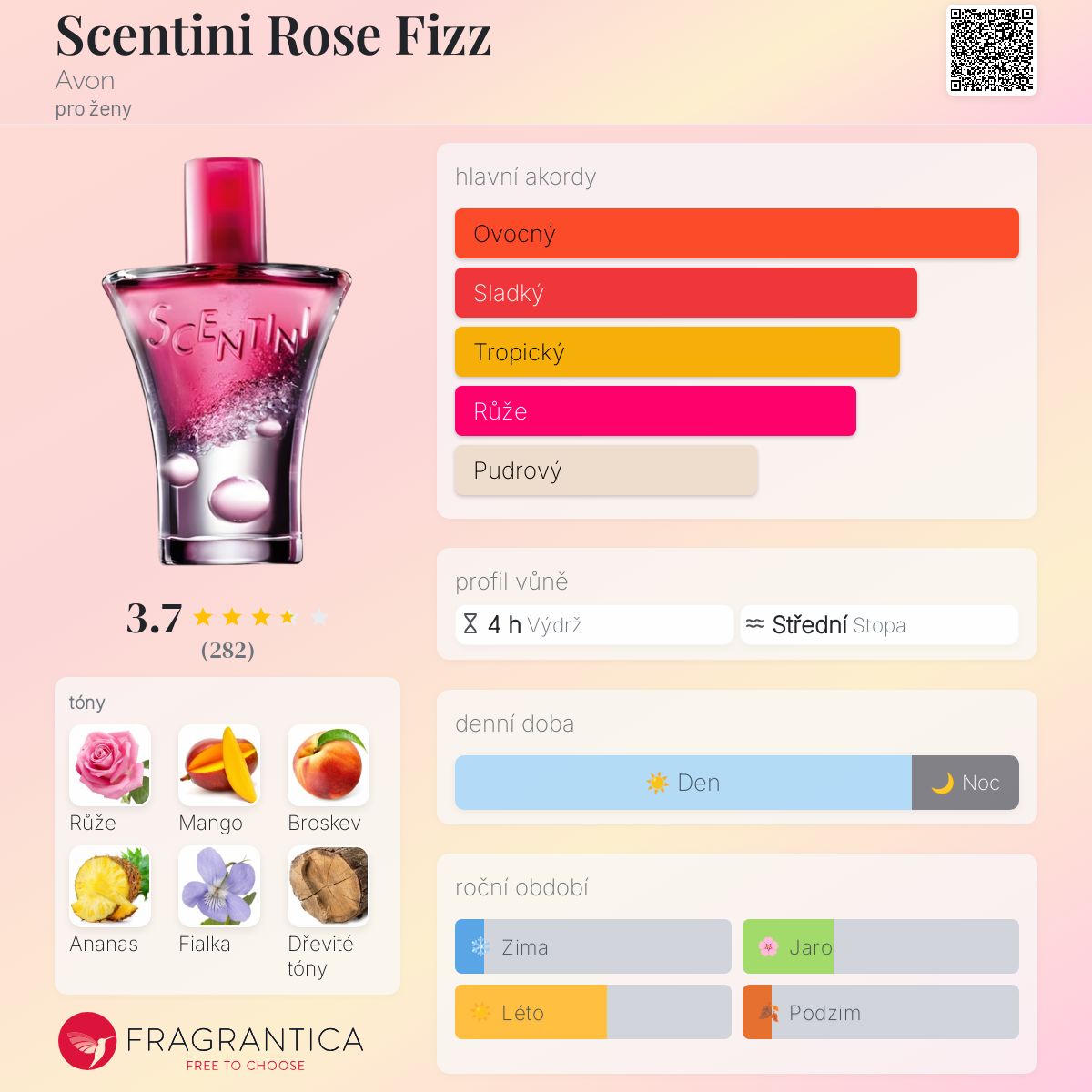 Scentini Rose Fizz podle Avon je Floral Fruity vůně pro ženy. Scentini Rose Fizz byl/a uveden/a v roce 2011. Vrchní tóny jsou Mango, Broskev a Ananas; střední tóny jsouRůže a Fialka ; základní tón je Dřevité tóny.