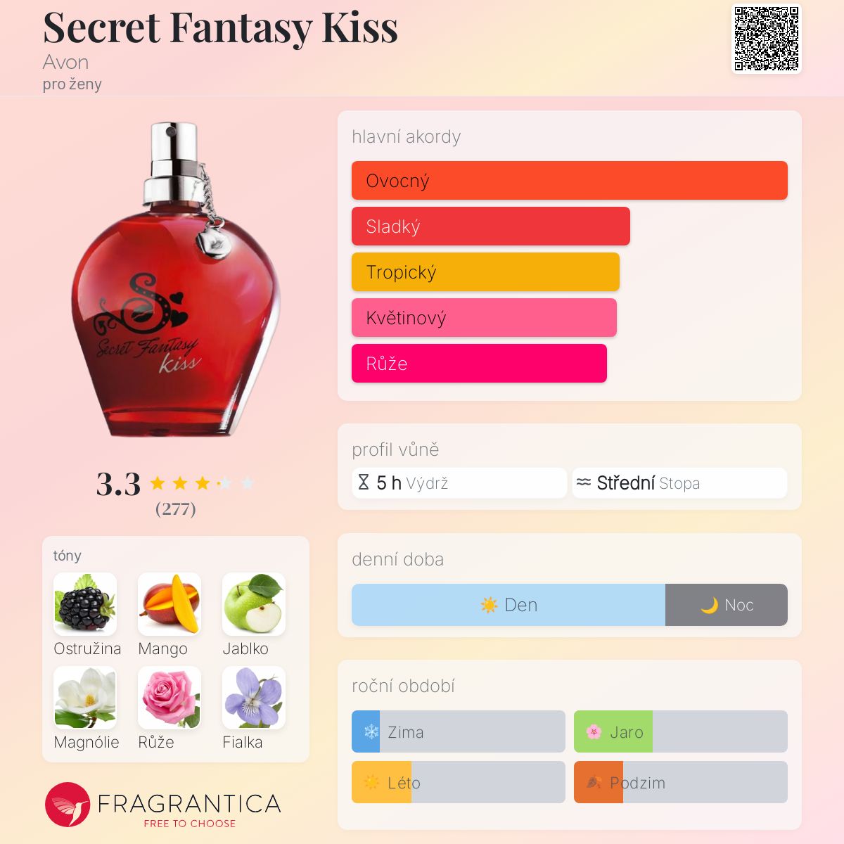 Secret Fantasy Kiss podle Avon je Floral Fruity vůně pro ženy. Secret Fantasy Kiss byl/a uveden/a v roce 2012. Vrchní tóny jsou Ostružina, Mango a Zelené jablko; střední tóny jsouMagnólie, Okvětní lístky růží a Fialka ; základní tóny jsou Jantar (ambra), Santalové dřevo a Mech.