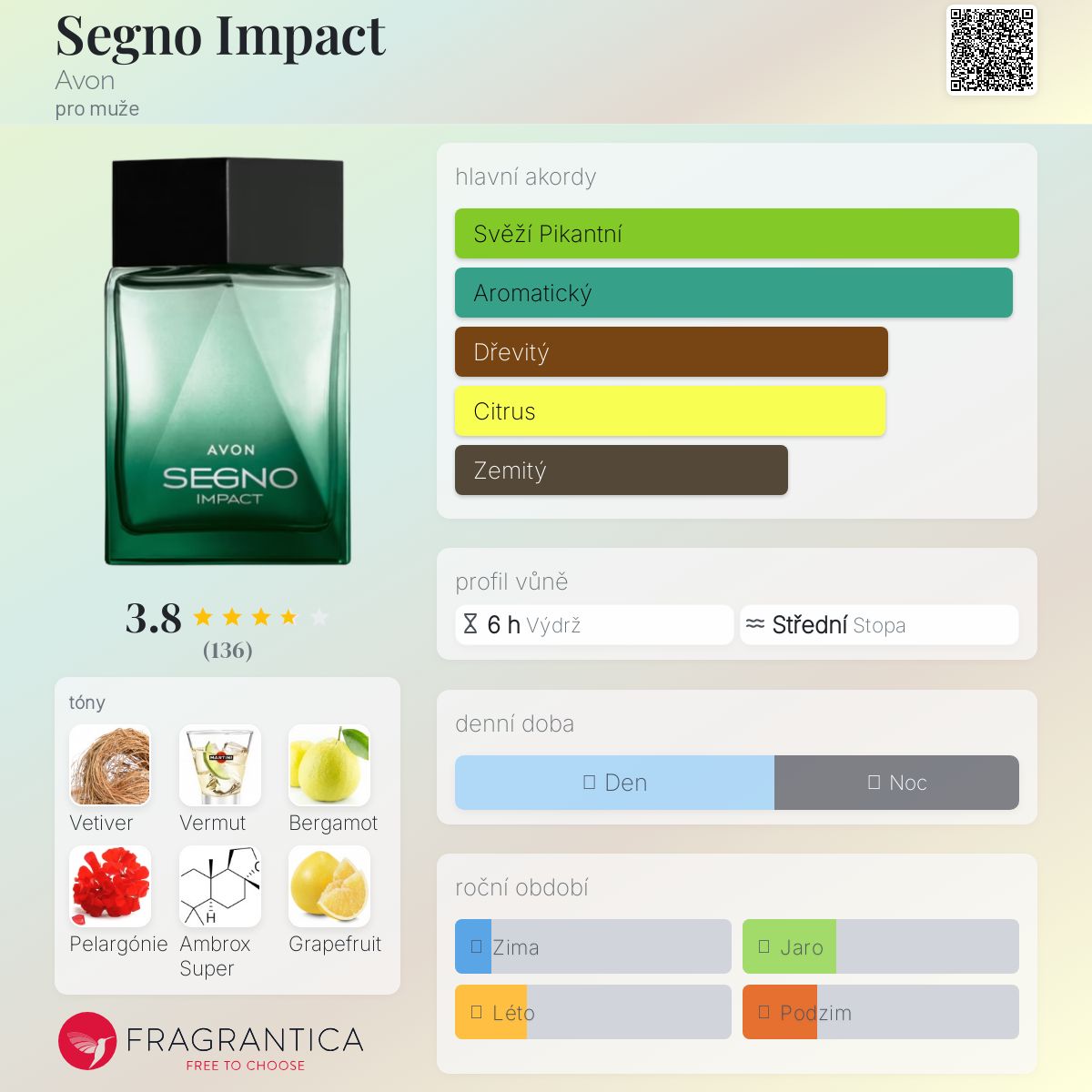 Segno Impact podle Avon je Woody Aromatic vůně pro muže. Segno Impact byl/a uveden/a v roce 2021. "Nosem" za touto vůní je Frank Voelkl. Vrchní tóny jsou Vermut, Bergamot a Grapefruit; střední tóny jsouPelargónie, Černý pepř a Muškátový oříšek ; základní tóny jsou Vetiver, Ambrox Super a Cedr.