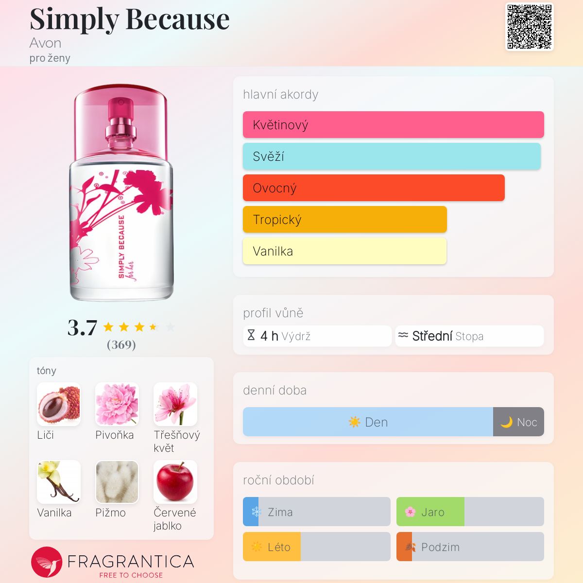 Simply Because podle Avon je Floral Fruity vůně pro ženy. Simply Because byl/a uveden/a v roce 2010. Vrchní tóny jsou Liči, Červené jablko a Bergamot; střední tóny jsouPivoňka, Třešňový květ a Jasmín ; základní tóny jsou Vanilka, Bílé pižmo a Bílé dřevo.