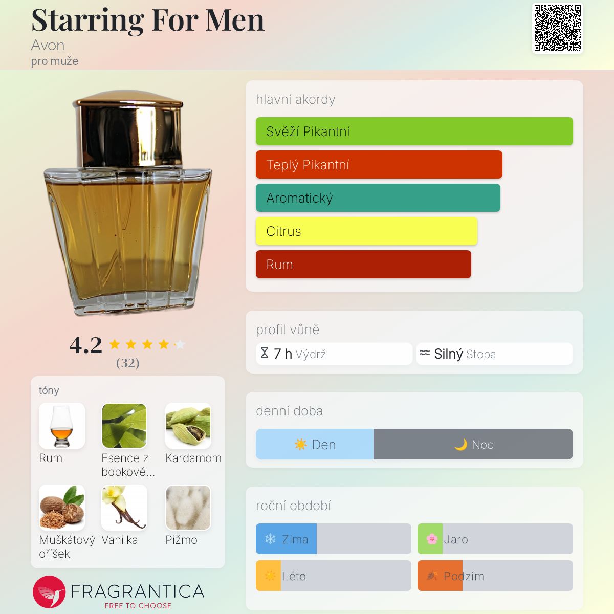 Starring For Men podle Avon je Orientální vůně pro muže. Starring For Men byl/a uveden/a v roce 1997. Vrchní tóny jsou Muškátový oříšek, Bergamot, Zelené jablko a Mandarinka; střední tóny jsouRum, Esence z bobkového listu, Kardamom a Šalvěj ; základní tóny jsou Vanilka a Pižmo.