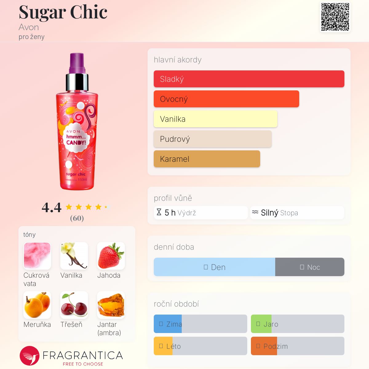 Sugar Chic podle Avon je Citrus Gourmand vůně pro ženy. Sugar Chic byl/a uveden/a v roce 2013. Vrchní tóny jsou Jahoda, Třešeň a Mandarinka; střední tóny jsouMeruňka a Pižmo ; základní tóny jsou Cukrová vata, Vanilka a Jantar (ambra).