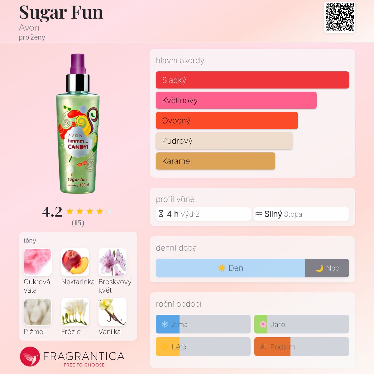 Sugar Fun podle Avon je Floral Fruity Gourmand vůně pro ženy. Sugar Fun byl/a uveden/a v roce 2014. Vrchní tóny jsou Nektarinka, Broskvový květ a Červené ovoce; střední tóny jsouRůžová frézie, Jasmín a Růže ; základní tóny jsou Cukrová vata, Pižmo a Vanilka.