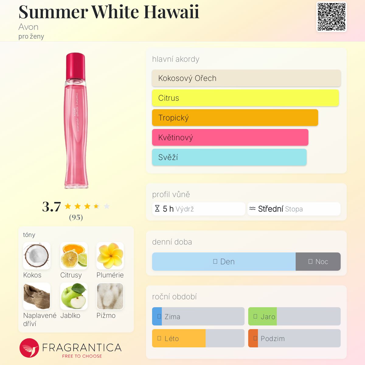 Summer White Hawaii podle Avon je Floral Fruity vůně pro ženy. Summer White Hawaii byl/a uveden/a v roce 2022. "Nosem" za touto vůní je Seckin Begen. Vrchní tóny jsou Kokos, Citrusy a Jablko; střední tóny jsouPlumérie, Růže a Jasmín ; základní tóny jsou Kokos, Naplavené dříví a Bílé pižmo.