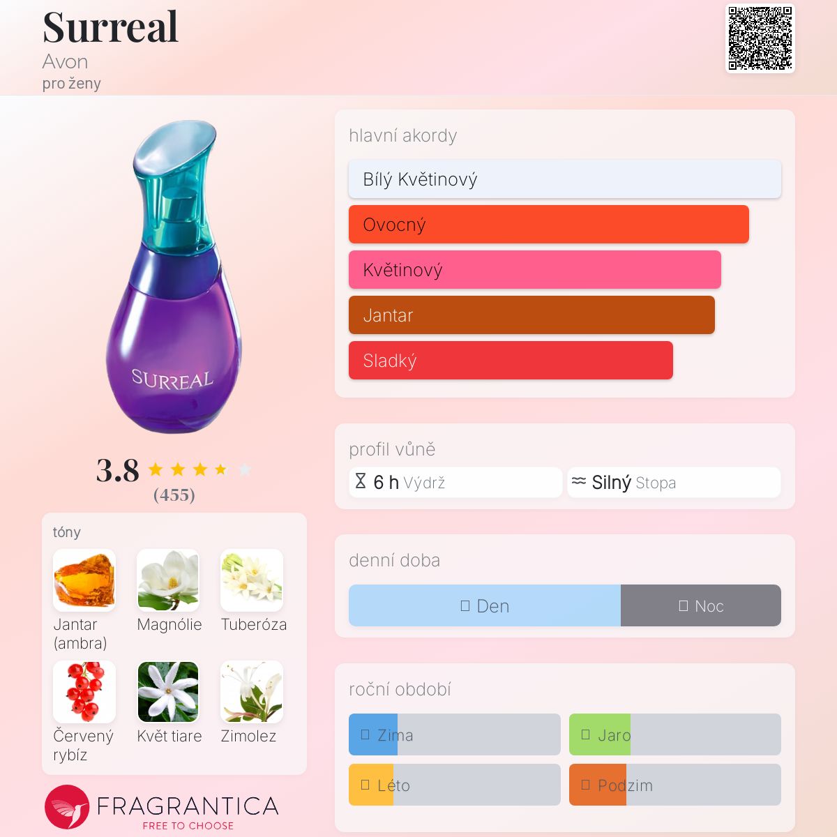 Surreal podle Avon je Floral vůně pro ženy. Surreal byl/a uveden/a v roce 2006. "Nosem" za touto vůní je Yves Cassar. Vrchní tóny jsou Tuberóza, Červený rybíz a Malinový list; střední tóny jsouMagnólie, Květ tiare, Zimolez a Orchidej ; základní tóny jsou Jantar (ambra), Pačuli, Pižmo a Fazole tonka.
