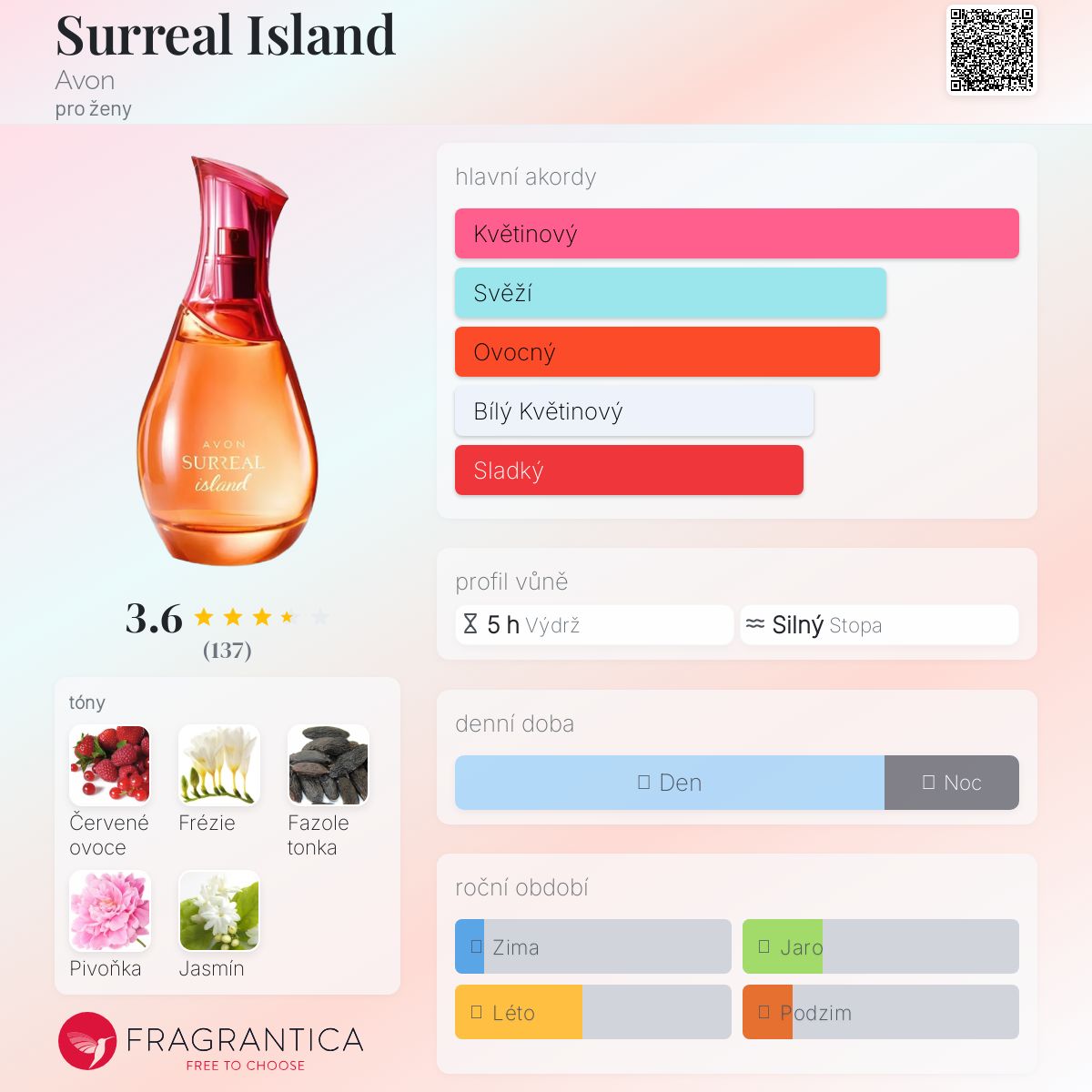 Surreal Island podle Avon je Floral Fruity vůně pro ženy. Surreal Island byl/a uveden/a v roce 2018. Vrchní tón je Červené ovoce ; střední tóny jsouFrézie, Pivoňka a Jasmín ; základní tón je Fazole tonka.