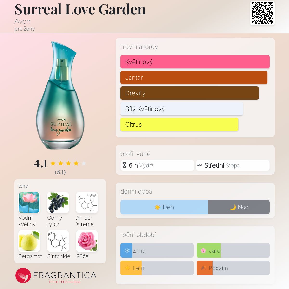 Surreal Love Garden podle Avon je Floral Aquatic vůně pro ženy. Surreal Love Garden byl/a uveden/a v roce 2021. Surreal Love Garden byl/a vytvořen/a IFF a Patty Hidalgo. Vrchní tóny jsou Vodní květiny, Černý rybíz a Bergamot; střední tóny jsouRůže, Pomerančový květ a Jasmín ; základní tóny jsou Amber Xtreme, Sinfonide a Santalové dřevo.