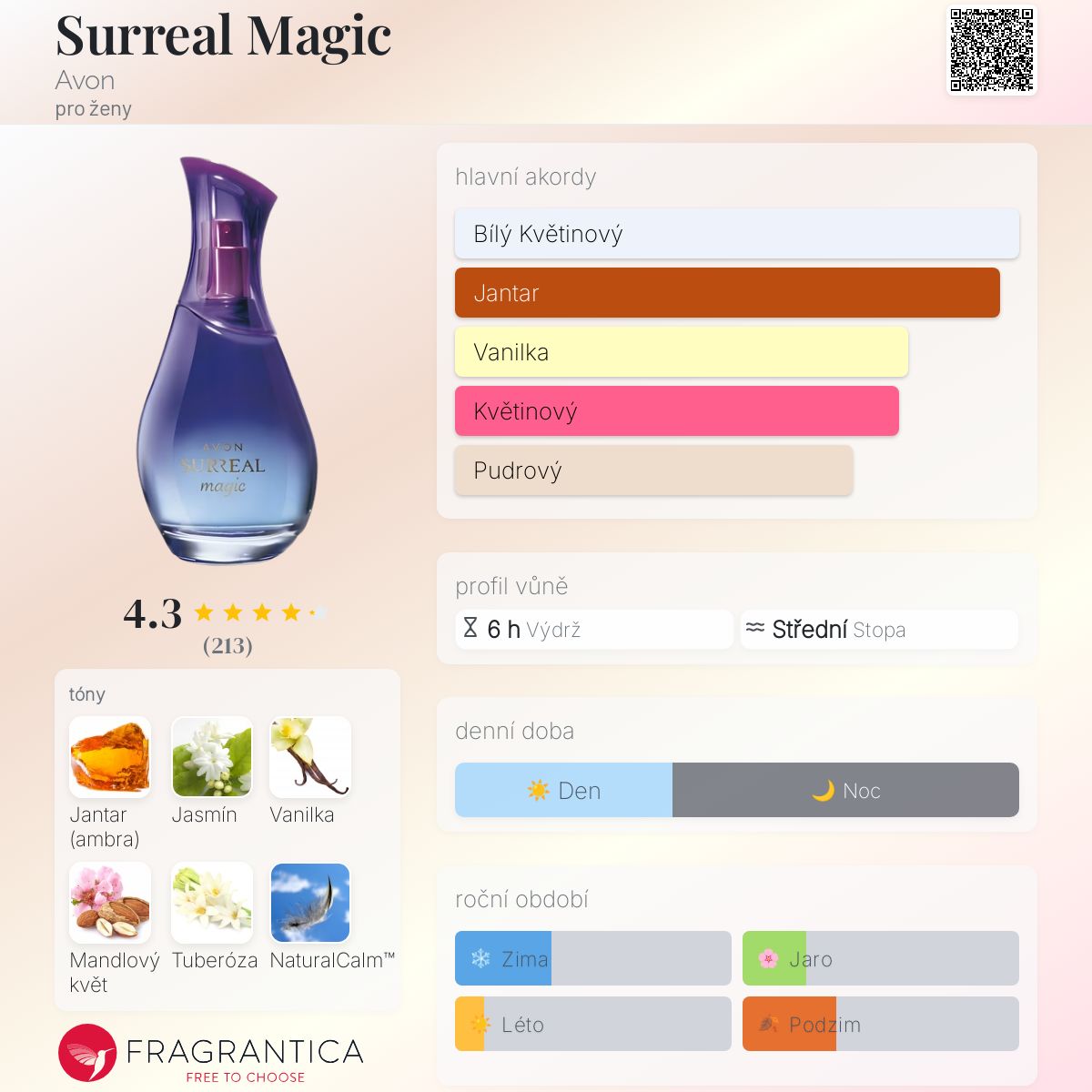 Surreal Magic podle Avon je Floral vůně pro ženy. Surreal Magic byl/a uveden/a v roce 2021. Vrchní tóny jsou Mandlový květ , NaturalCalm™ a Bergamot; střední tóny jsouJasmín Sambac, Tuberóza a Ylang-Ylang ; základní tóny jsou Jantar (ambra), Vanilka a Santalové dřevo.
